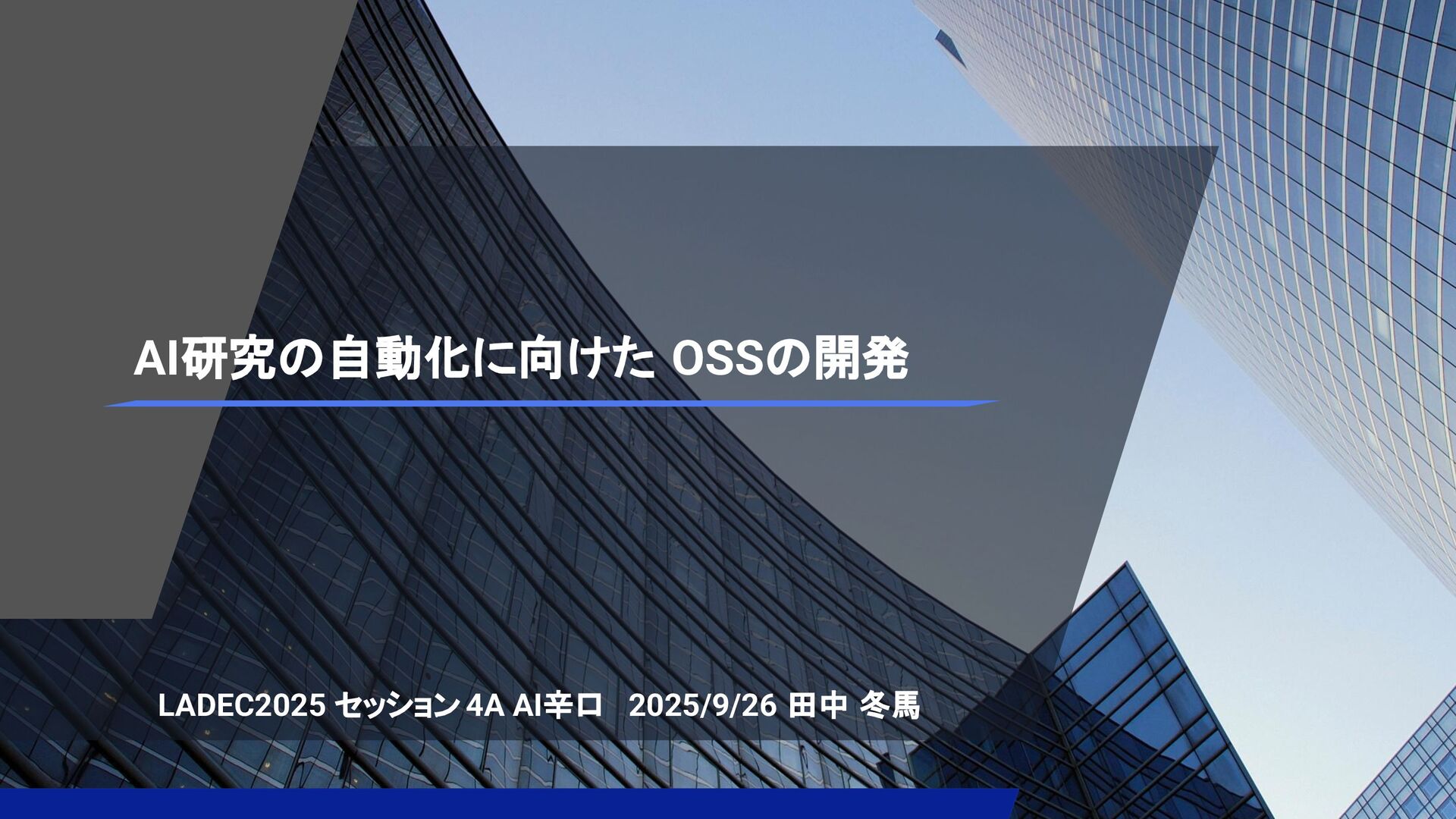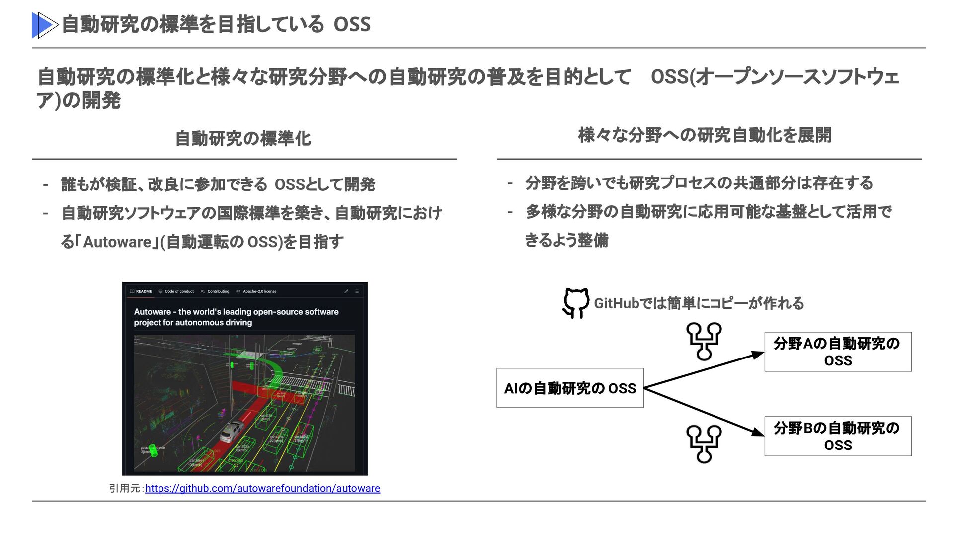 - 自動研究ソフトウェアの国際標準を築き、自動研究におけ る「Autoware」(自動運転の OSS)を目指す AIの自動研究の OSS 分野Aの自動研究の OSS 分野Bの自動研究の OSS GitHubでは簡単にコピーが作れる - 分野を跨いでも研究プロセスの共通部分は存在する - 多様な分野の自動研究に応用可能な基盤として活用で きるよう整備 引用元:https://github.com/autowarefoundation/autoware