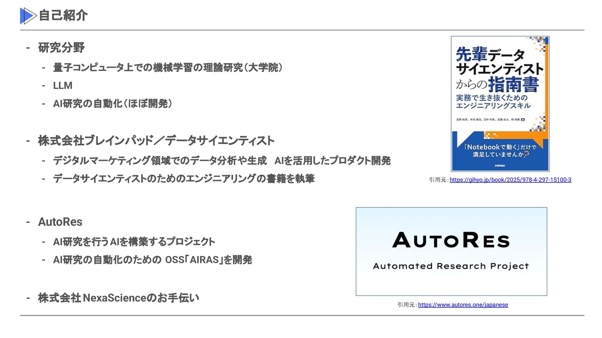 株式会社ブレインパッド/データサイエンティスト - デジタルマーケティング領域でのデータ分析や生成 AIを活用したプロダクト開発 - データサイエンティストのためのエンジニアリングの書籍を執筆 - AutoRes - AI研究を行う AIを構築するプロジェクト - AI研究の自動化のための OSS「AIRAS」を開発 - 株式会社NexaScienceのお手伝い 引用元:https://www.autores.one/japanese 引用元:https://gihyo.jp/book/2025/978-4-297-15100-3