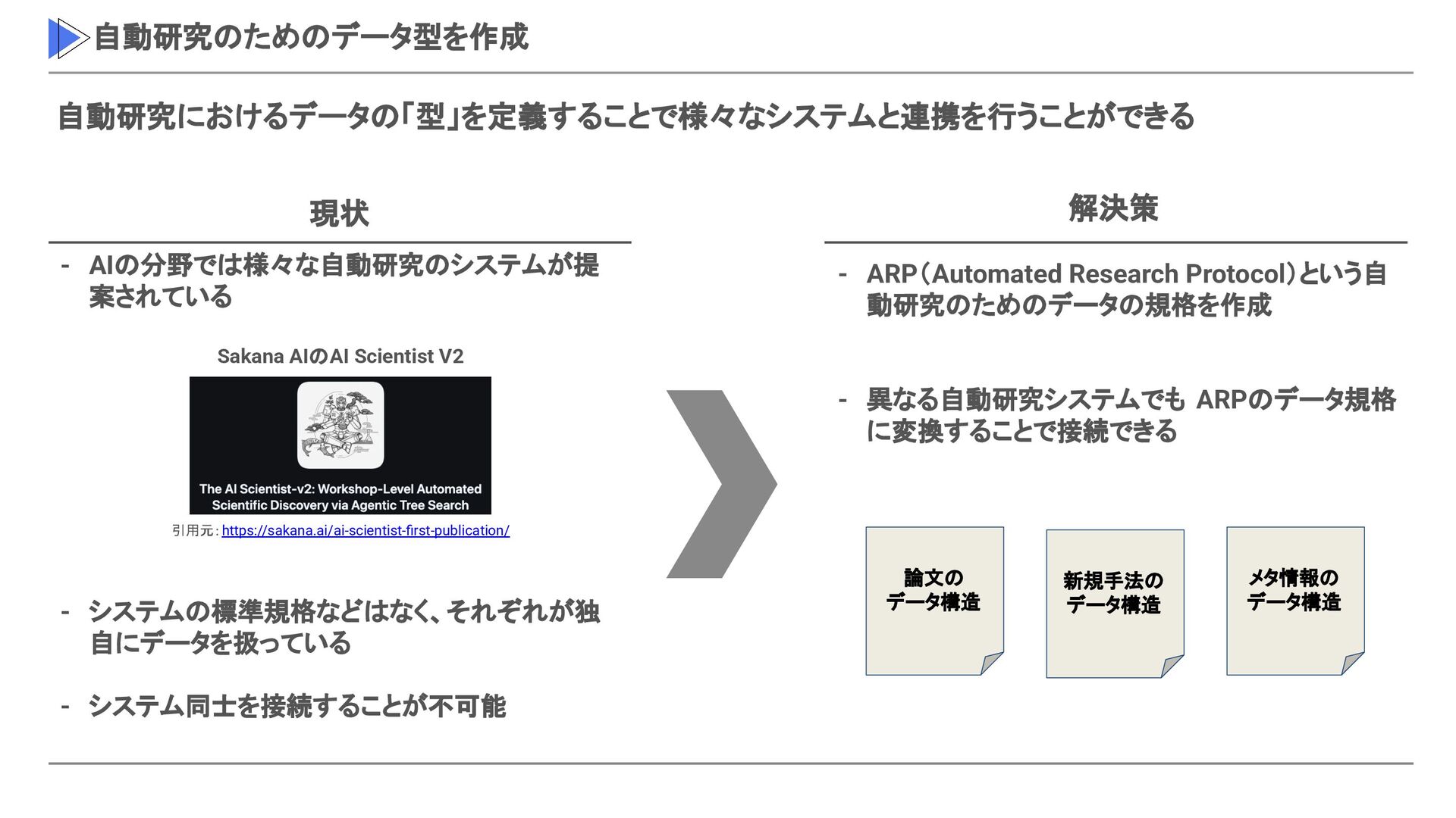- ARP(Automated Research Protocol)という自 動研究のためのデータの規格を作成 - 異なる自動研究システムでも ARPのデータ規格 に変換することで接続できる 引用元:https://sakana.ai/ai-scientist-first-publication/ 現状 解決策 Sakana AIのAI Scientist V2 論文の データ構造 新規手法の データ構造 メタ情報の データ構造