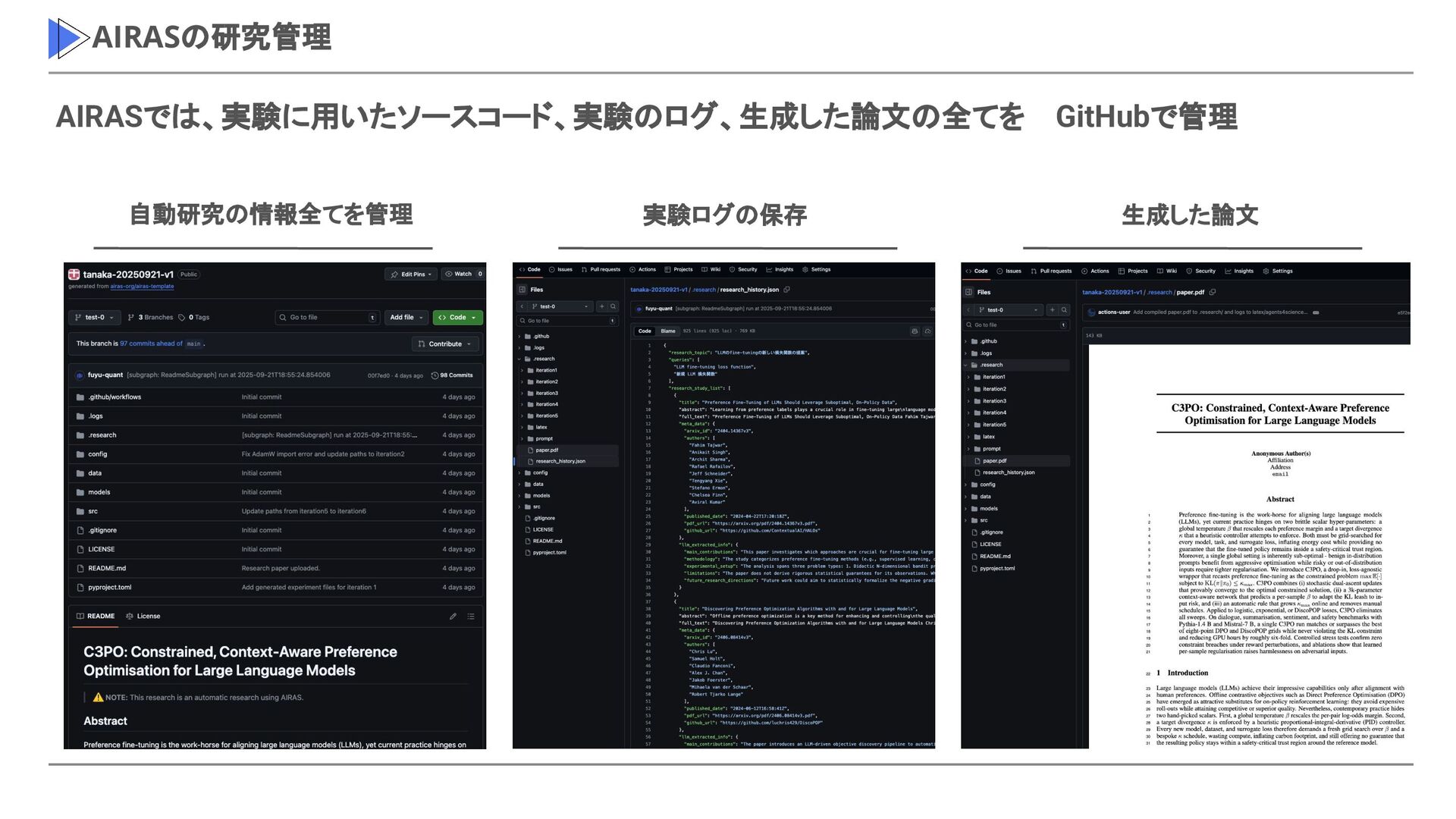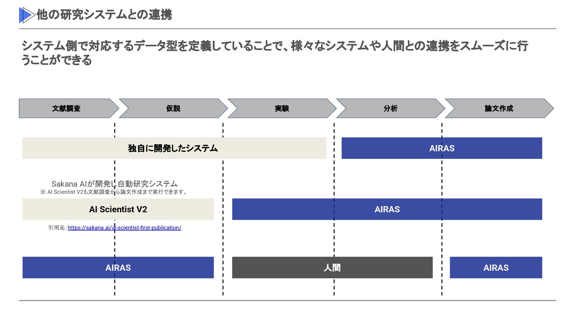 人間 AIRAS AI Scientist V2 AIRAS AIRAS 引用元:https://sakana.ai/ai-scientist-first-publication/ Sakana AIが開発し自動研究システム ※ AI Scientist V2も文献調査から論文作成まで実行できます。
