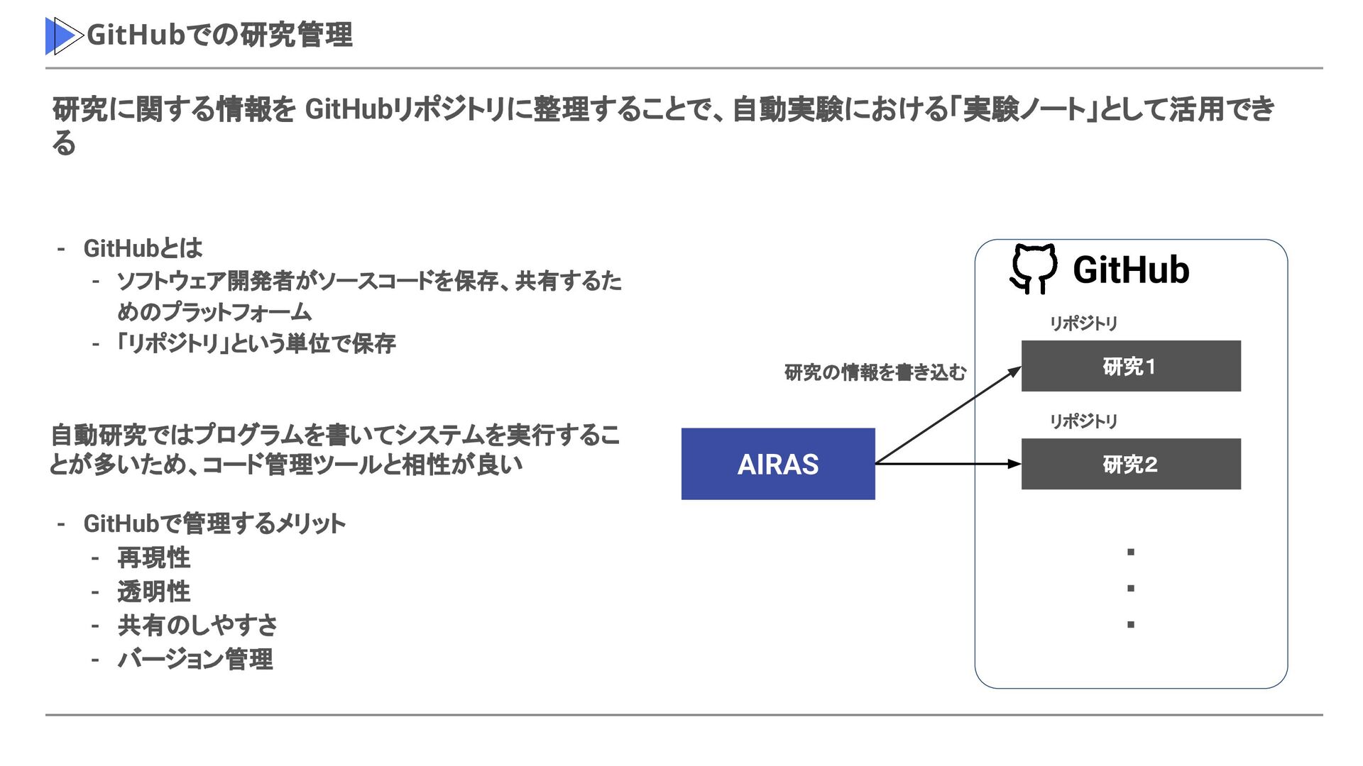 8. GitHubでの研究管理 AIRAS 研究に関する情報を GitHubリポジトリに整理することで、自動実験における「実験ノート」として活用でき る GitHub - GitHubとは - ソフトウェア開発者がソースコードを保存、共有するた