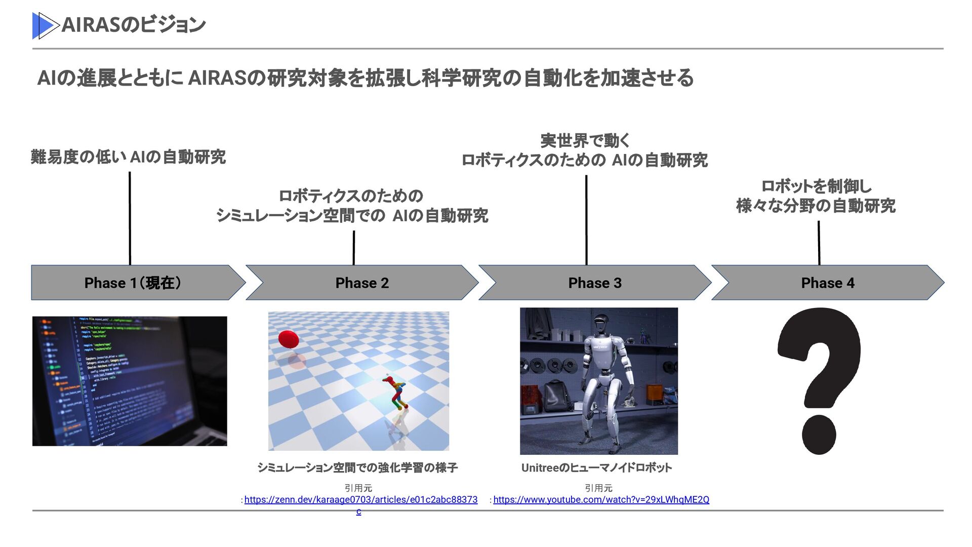 Phase 1(現在) Phase 2 Phase 3 Phase 4 難易度の低い AIの自動研究 ロボティクスのための シミュレーション空間での AIの自動研究 実世界で動く ロボティクスのための AIの自動研究 ロボットを制御し 様々な分野の自動研究