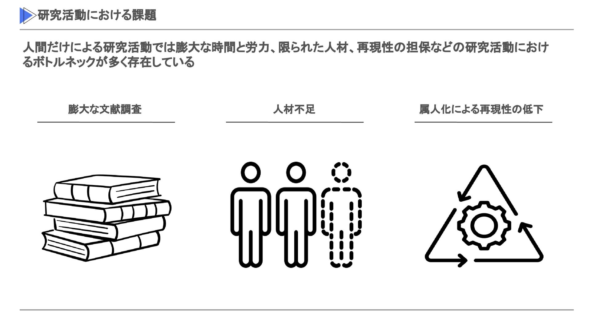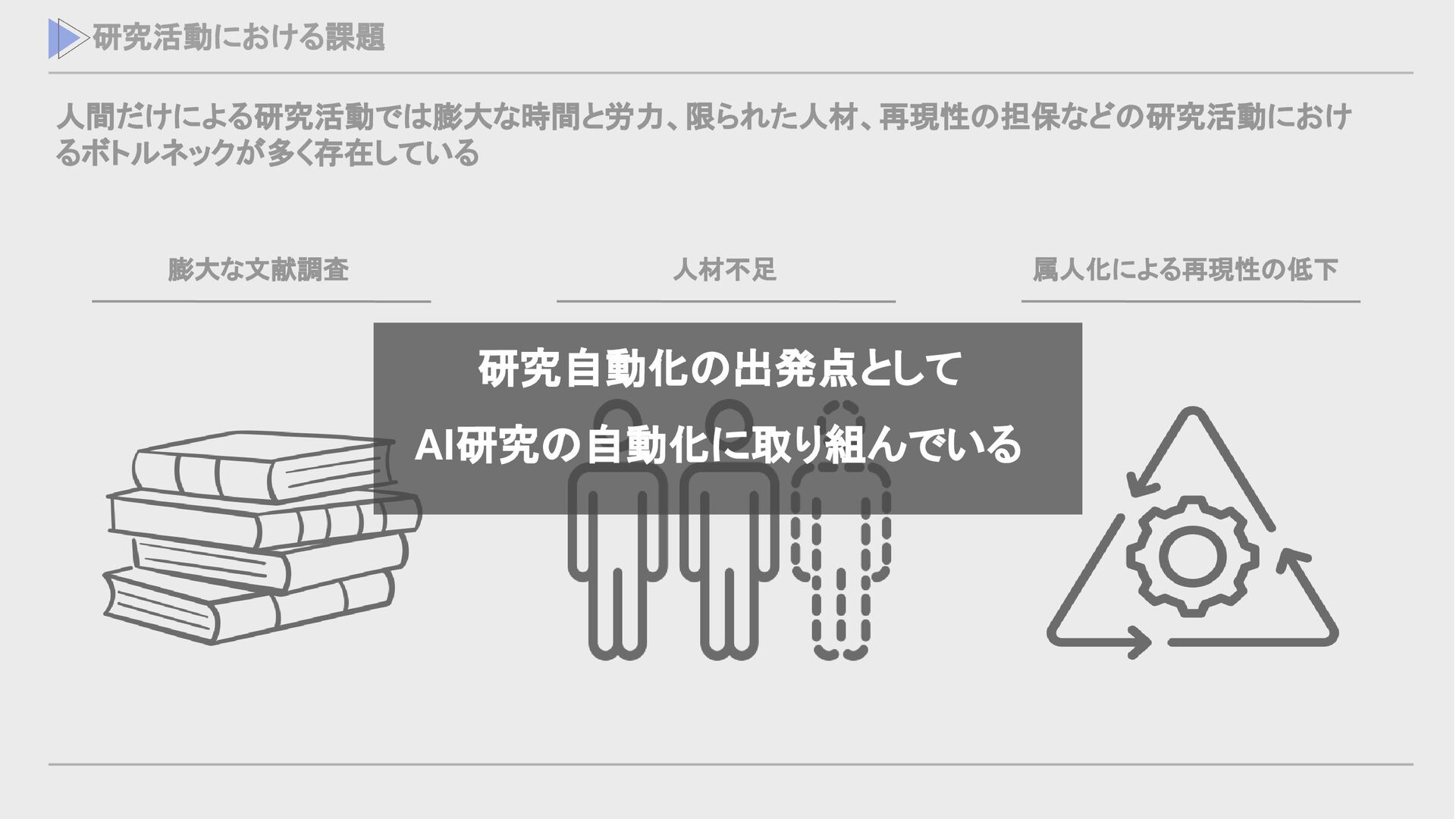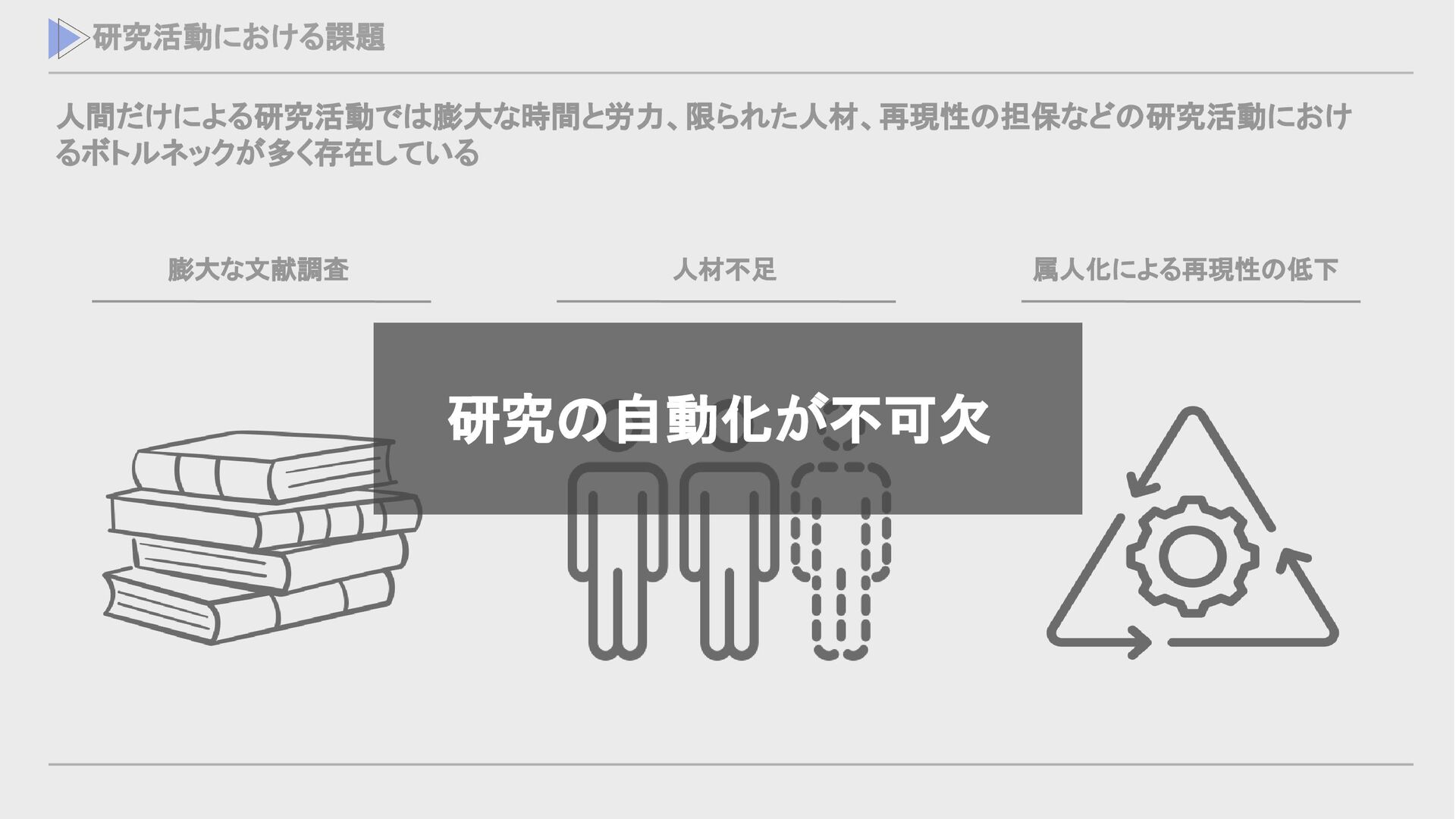 2. なぜAI研究を自動化するのか 研究の自動化を進めるためには AIの発展が不可欠である。また、 AI研究自体はコンピュータ上で研究 を完結させることができるため自動化に向いている。 AIの自動研究の重要性 実験環境を準備する容易さ AIの自動研究 - AIの自動研究を推進することは、