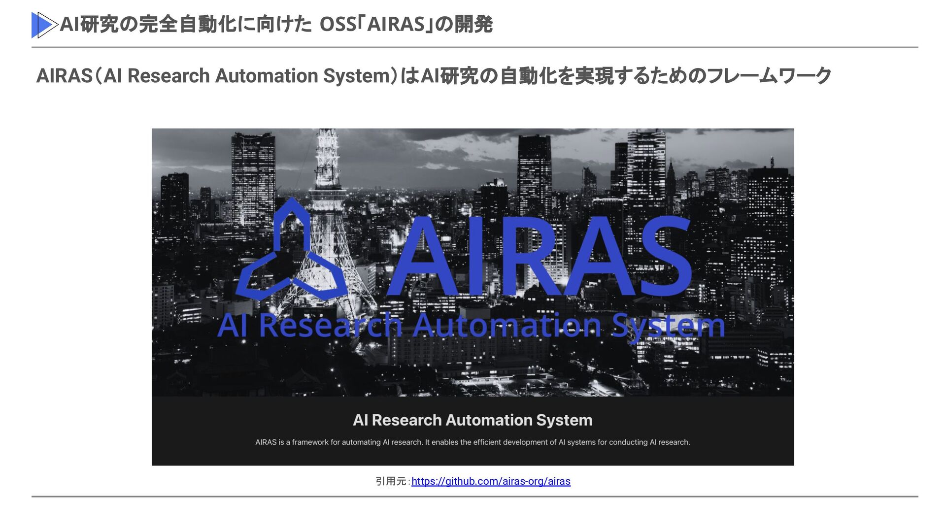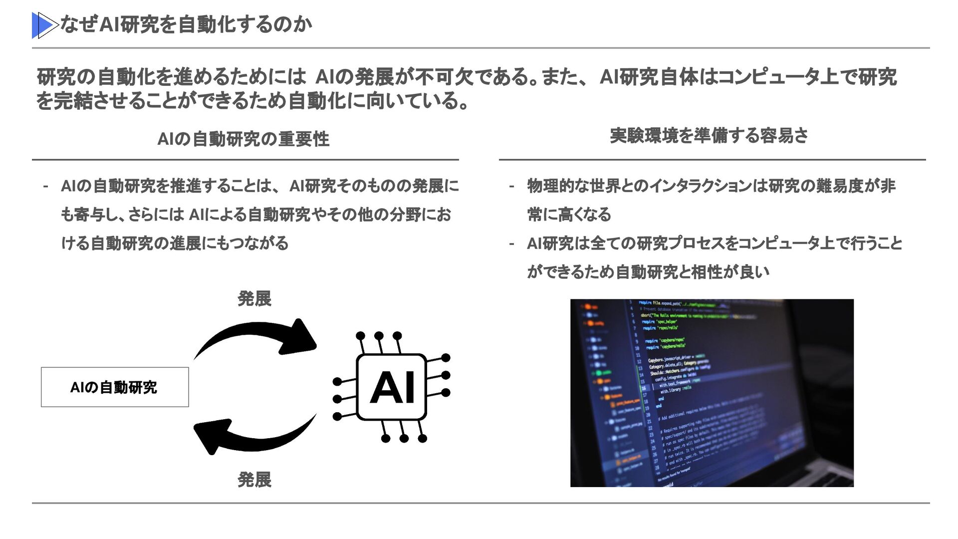 AI研究そのものの発展に も寄与し、さらには AIによる自動研究やその他の分野にお ける自動研究の進展にもつながる - 物理的な世界とのインタラクションは研究の難易度が非 常に高くなる - AI研究は全ての研究プロセスをコンピュータ上で行うこと ができるため自動研究と相性が良い 発展 発展