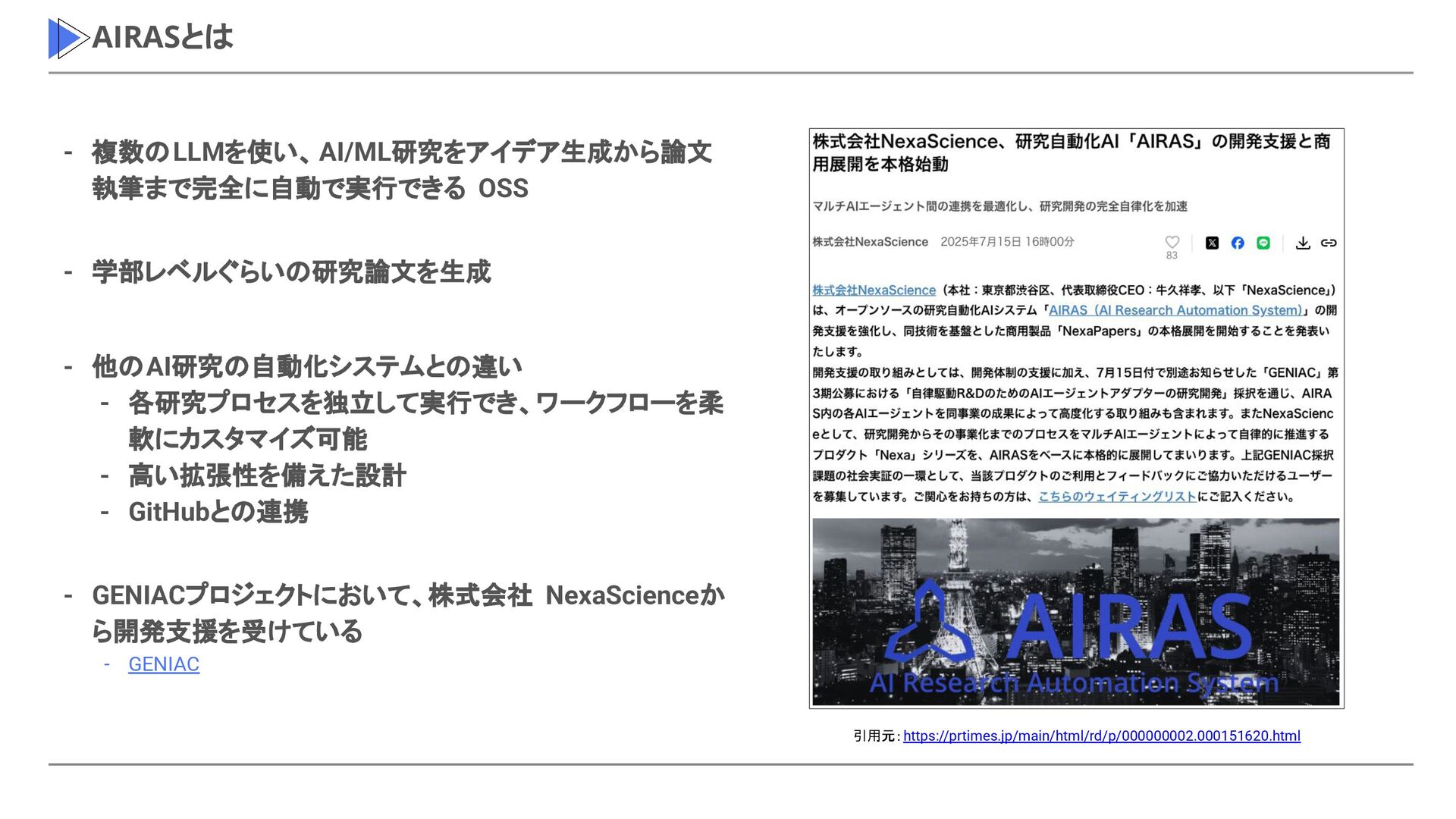 各研究プロセスを独立して実行でき、ワークフローを柔 軟にカスタマイズ可能 - 高い拡張性を備えた設計 - GitHubとの連携 - GENIACプロジェクトにおいて、株式会社 NexaScienceか ら開発支援を受けている - GENIAC 引用元:https://prtimes.jp/main/html/rd/p/000000002.000151620.html