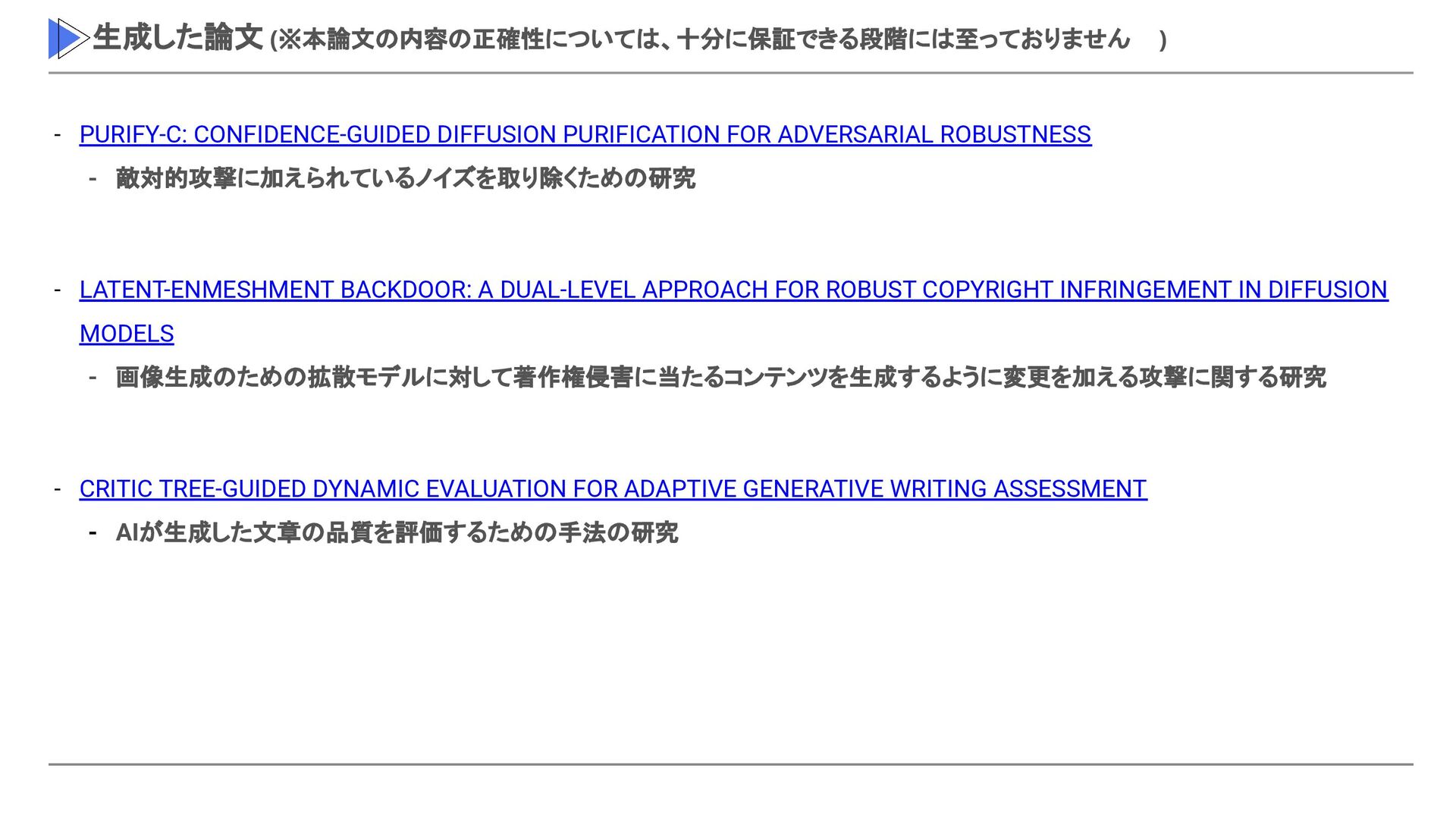 ROBUSTNESS - 敵対的攻撃に加えられているノイズを取り除くための研究 - LATENT-ENMESHMENT BACKDOOR: A DUAL-LEVEL APPROACH FOR ROBUST COPYRIGHT INFRINGEMENT IN DIFFUSION MODELS - 画像生成のための拡散モデルに対して著作権侵害に当たるコンテンツを生成するように変更を加える攻撃に関する研究 - CRITIC TREE-GUIDED DYNAMIC EVALUATION FOR ADAPTIVE GENERATIVE WRITING ASSESSMENT - AIが生成した文章の品質を評価するための手法の研究