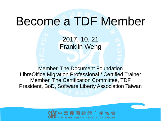 My lightning talk in OpenSUSE Asia 2017 (and LibreOffice mini Conference Japan 2017), talking about how and why to become a TDF member.
