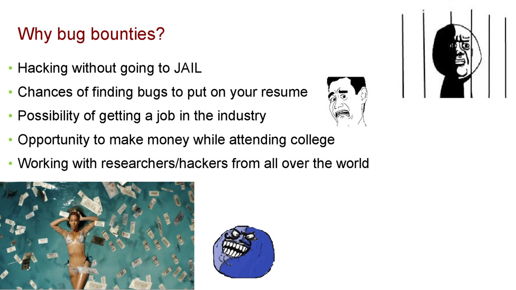Chances of finding bugs to put on your resume • Possibility of getting a job in the industry • Opportunity to make money while attending college • Working with researchers/hackers from all over the world