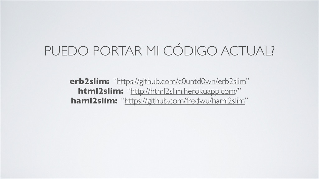 PUEDO PORTAR MI CÓDIGO ACTUAL? erb2slim: “https://github.com/c0untd0wn/erb2slim” html2slim: “http://html2slim.herokuapp.com/” haml2slim: