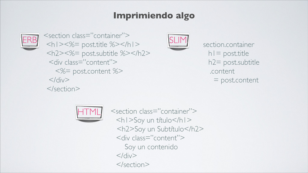 Soy un contenido </div> </section> <section class=”container”> <h1><%= post.title %></h1> <h2><%= post.subtitle %></h2> <div class=”content”> <%= post.content %> </div> </section> section.container h1= post.title h2= post.subtitle .content = post.content Imprimiendo algo SLIM ERB HTML