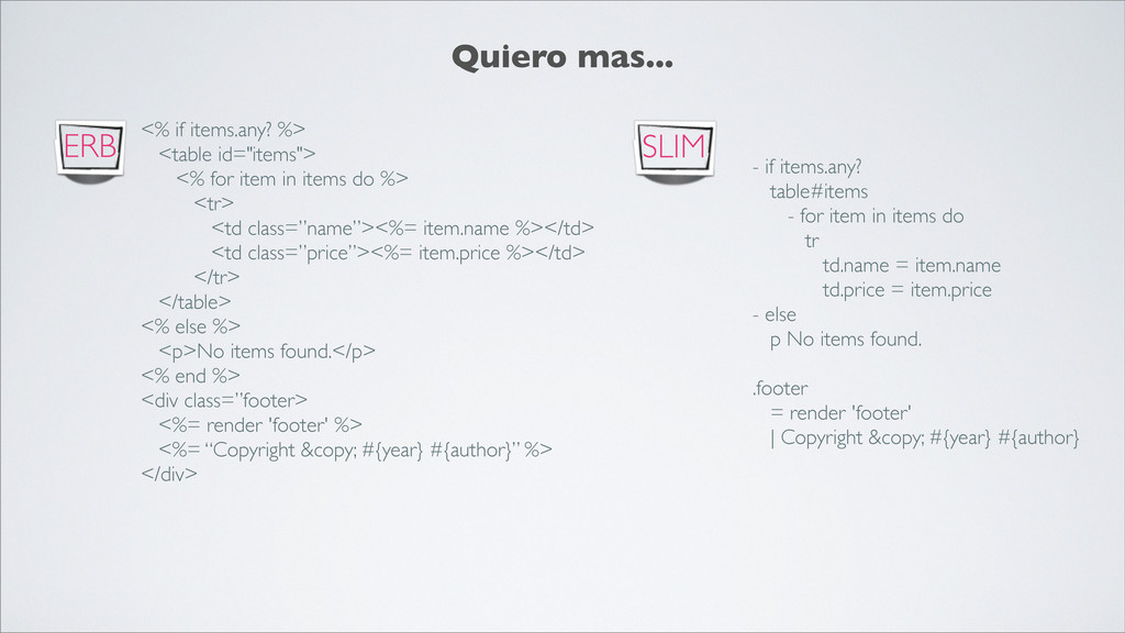 items do %> <tr> <td class=”name”><%= item.name %></td> <td class=”price”><%= item.price %></td> </tr> </table> <% else %> <p>No items found.</p> <% end %> <div class=”footer> <%= render 'footer' %> <%= “Copyright © #{year} #{author}” %> </div> - if items.any? table#items - for item in items do tr td.name = item.name td.price = item.price - else p No items found. .footer = render 'footer' | Copyright © #{year} #{author} Quiero mas... SLIM ERB