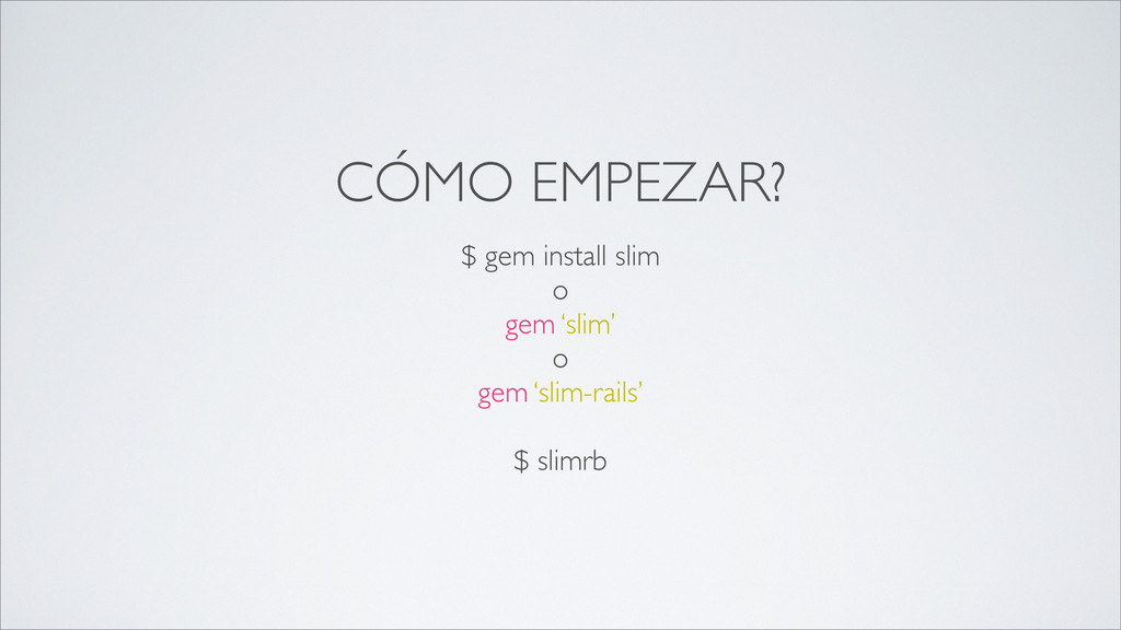 CÓMO EMPEZAR? $ gem install slim o gem ‘slim’ o