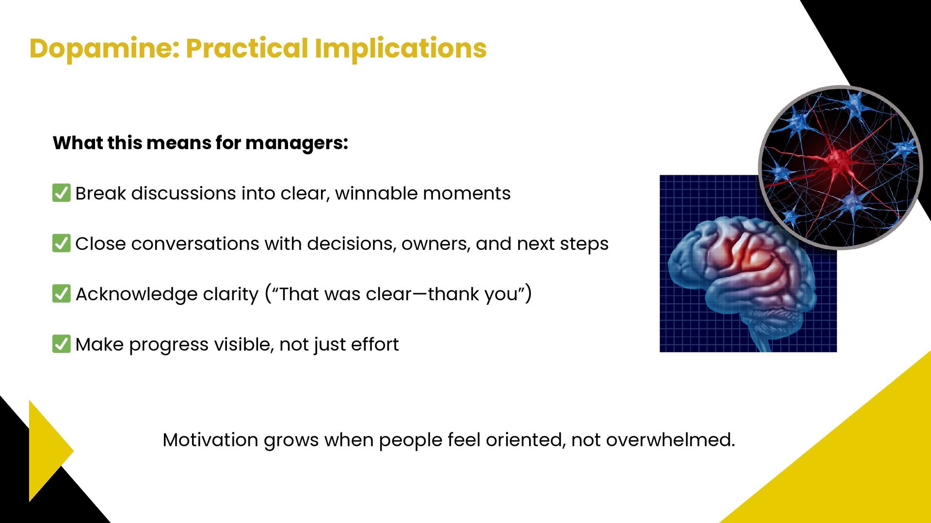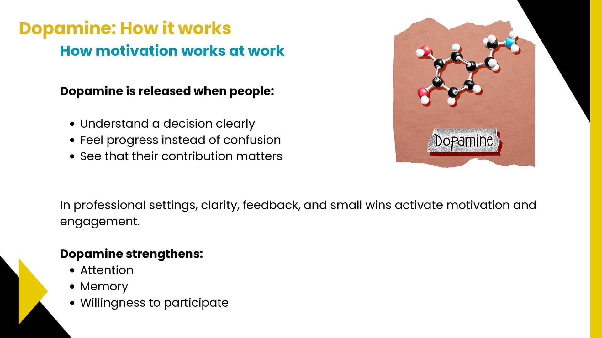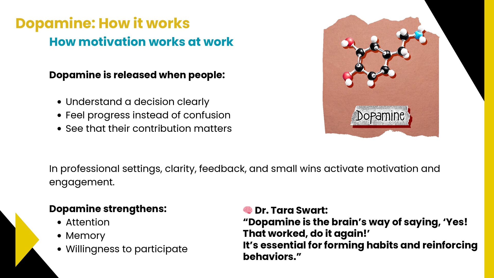 progress instead of confusion See that their contribution matters In professional settings, clarity, feedback, and small wins activate motivation and engagement. Dopamine strengthens: Attention Memory Willingness to participate How motivation works at work Dopamine: How it works 🧠 Dr. Tara Swart: “Dopamine is the brain’s way of saying, ‘Yes! That worked, do it again!’ It’s essential for forming habits and reinforcing behaviors.”