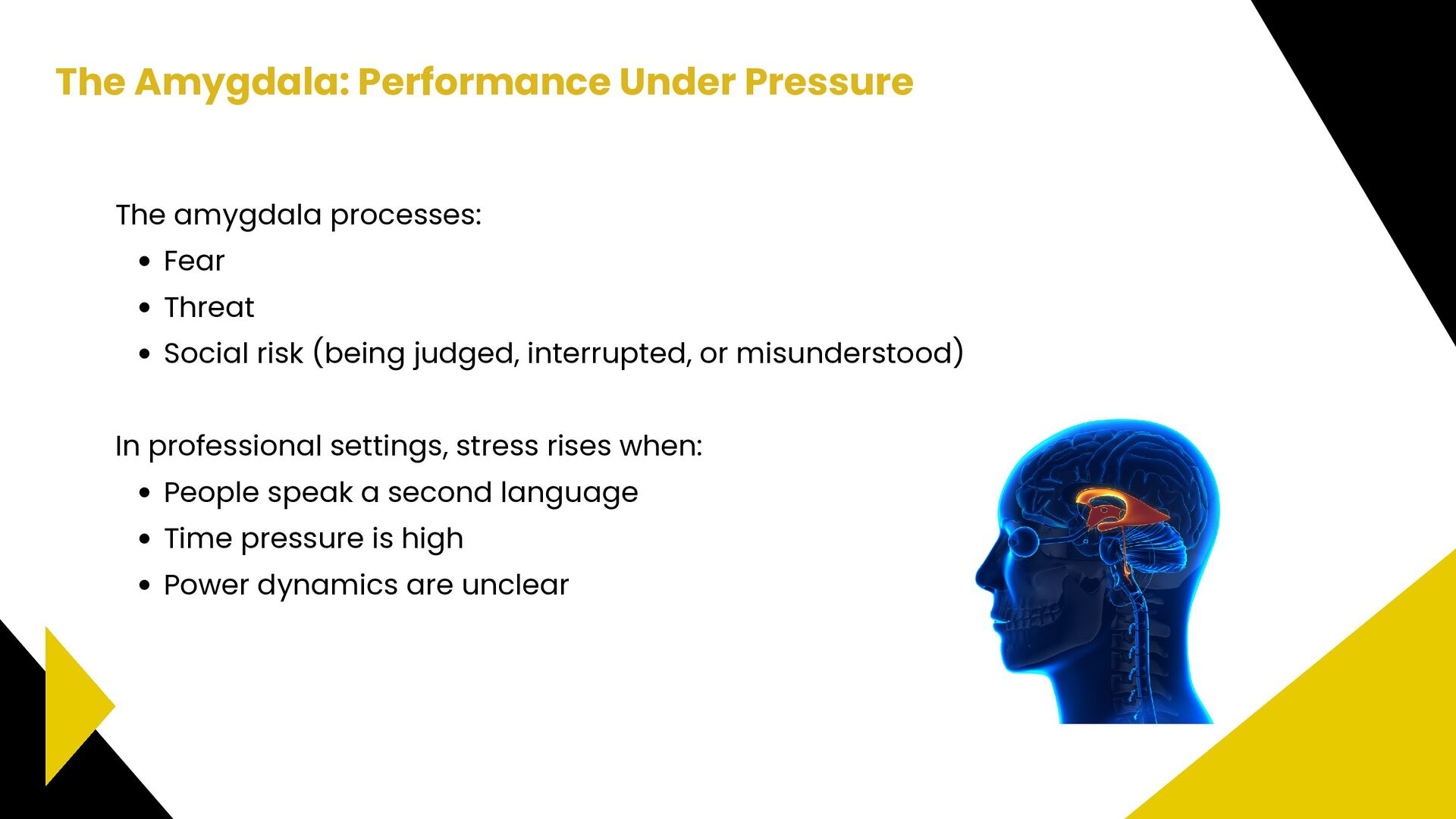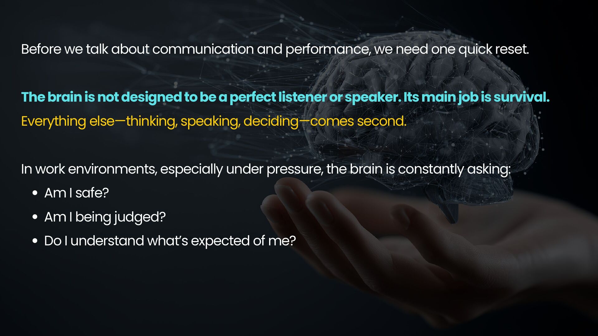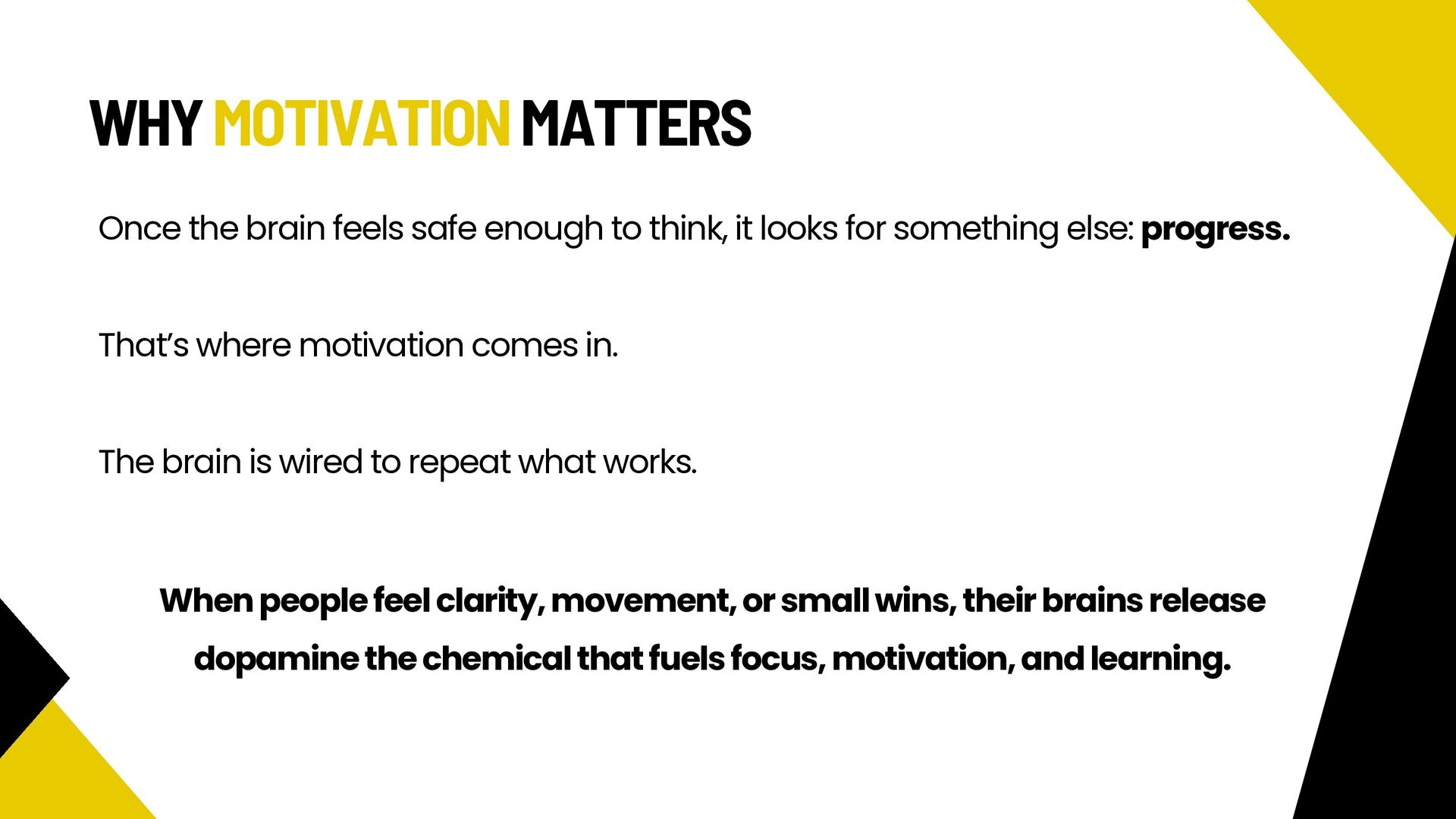 progress instead of confusion See that their contribution matters In professional settings, clarity, feedback, and small wins activate motivation and engagement. Dopamine strengthens: Attention Memory Willingness to participate How motivation works at work Dopamine: How it works 🧠 Dr. Tara Swart: “Dopamine is the brain’s way of saying, ‘Yes! That worked, do it again!’ It’s essential for forming habits and reinforcing behaviors.”