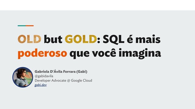 • Developer Advocate para o Google Cloud • Foco em bancos de dados • Engenheira de Dados (Data Engineer) • Desenvolvedora PHP/Ruby/JavaScript por muito tempo. • SQL Nerd