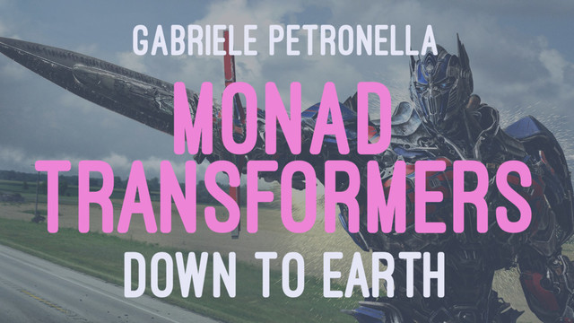 first <- readName.liftM[EitherT[?[_], String, ?]].liftM[OptionT] last <- readName.liftM[(EitherT[?[_], String, ?]].liftM[OptionT] name <- if ((first.length * last.length) < 20) OptionT.some[EitherT[Task, String, ?], String](s"$first $last") else OptionT.none[EitherT[Task, String, ?], String] _ <- (if (name == "Daniel Spiewak") EitherT.fromDisjunction[Task](\/.left[String, Unit]("your kind isn't welcome here")) else EitherT.fromDisjunction[Task](\/.right[String, Unit](()))).liftM[OptionT] _ <- log(s"successfully read in $name").liftM[EitherT[?[_], String, ?]].liftM[OptionT] } yield name 1 from djspiewak/emm @gabro27 Scala Swarm 2017