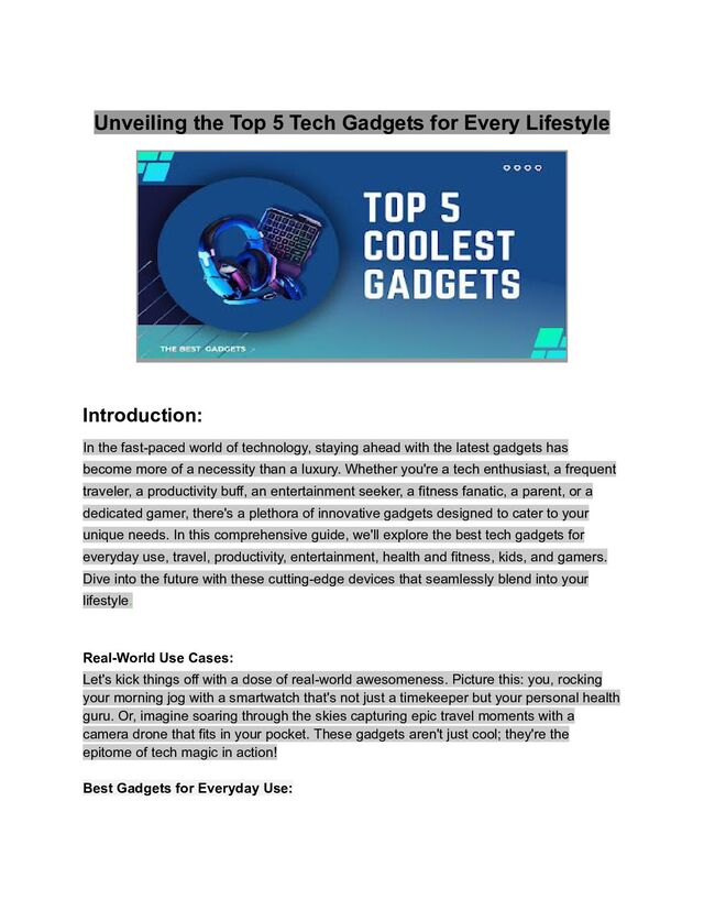 In the fast-paced world of technology, staying ahead with the latest gadgets has become more of a necessity than a luxury. Whether you're a tech enthusiast, a frequent traveler, a productivity buff, an entertainment seeker, a fitness fanatic, a parent, or a dedicated gamer, there's a plethora of innovative gadgets designed to cater to your unique needs. In this comprehensive guide, we'll explore the best tech gadgets for everyday use, travel, productivity, entertainment, health and fitness, kids, and gamers. Dive into the future with these cutting-edge devices that seamlessly blend into your lifestyle.