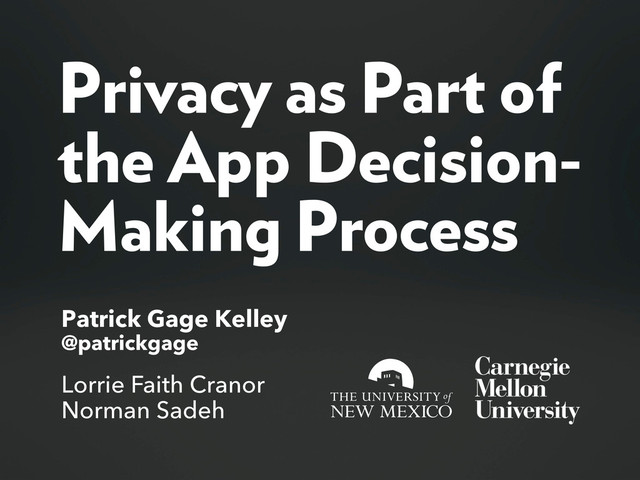 [email protected] patrickgagekelley.com S P E C I A L T H A N K S T O Alessandro Acquisti Seungyeop Han Matthew Kay Michelle Mazurek Janice Tsai David Wetherall Sunny Consolvo Jaeyeon Jung Jialiu Lin Manya Sleeper Tim Vidas