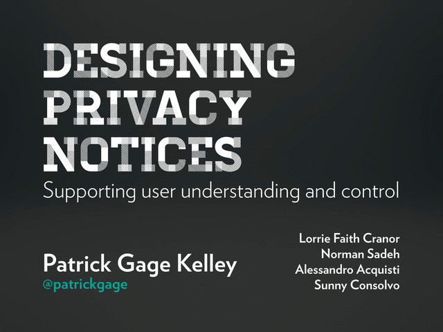 Elise, Sean, Tara, and all of the rest of my aunts and uncles and cousins and family. The entire CUPS Lab, especially: Rob, Serge, PK, Steve, Aleecia, Cristian, Kami, Yang, Blase, Michelle, Rebecca, Pedro, Peter, Saranga, Rich, Dave G, Janice, Manya. Lujo Bauer, Jason Hong, Nicholas Christin, Jodi Forlizzi, John Zimmerman, Golan Levin, Ben Fry, Carlos Guestrin, Osman Khan, Mary Shaw, Jaeyeon Jung, Robert Biddle, Stuart Schechter, Simson Garfinkle, Mary Ellen Zurko, Heather Lipford, Diana Smetters, Moira Burke, Paul André, Sean Munson, Justin Cranshaw, Mike Benisch, Behzod Sirjani, Scott W. H. Young, Stephanie Rosenthal, Danny Rashid, Rob Simmons. My research undergraduates: Luc, Joanna, Daniel, Jerry, Robin, Yael. My teachers: Hiller, Amit, Hoopsick, Mr. Schoell, Jessica, Molly, Anne, Marcia, Harry, David, Babak, Lisa, Katie The entire staff of the Tartan, especially: Bradford, Kristen, Shweta, Nikunja, Kristen, Claire, Andrew, Jess, Michael, Emily, Anna, Stacey, Courtney, Greg, Alan, Christa, Celia, JW, Marshall, Alex, Josh, Allison. My GSA friends: Carrie, Warren, Chad, Carolyn, DJ, Hillary, Ruth, Kate, Patrick, Jared, Timi, Aaron, Amelia, Jon, Kate, PJ, Alex, Denise, Mary Jo, Julia, David. Carnegie Mellon’s administrators and staff: Jared, Gina, Indira, Renee, Michael, Bob, Ralph, Queenie, Madelyn, Kim, Paula, Erika, and Gloriana. And all of my other friends: Dan, Ben, Aaron, Joseph, Ashley, Jackie, Greg, June, Kyle, Drew, Alex, Shelly, Colin, Craig, Max, Corinne, Katie, Phluff, Amy, Elise, Carolyn, Kerri, Cory, Kevin, Jamie, Melissa, Greg, Eric, Brian, Adam, Elliot, Ben, Erhardt, Josh, Caroline, Isaac, Matthew, Daniel, David, Andy, Marissa. And everyone else who is here today, in the room, digitally, and everywhere.