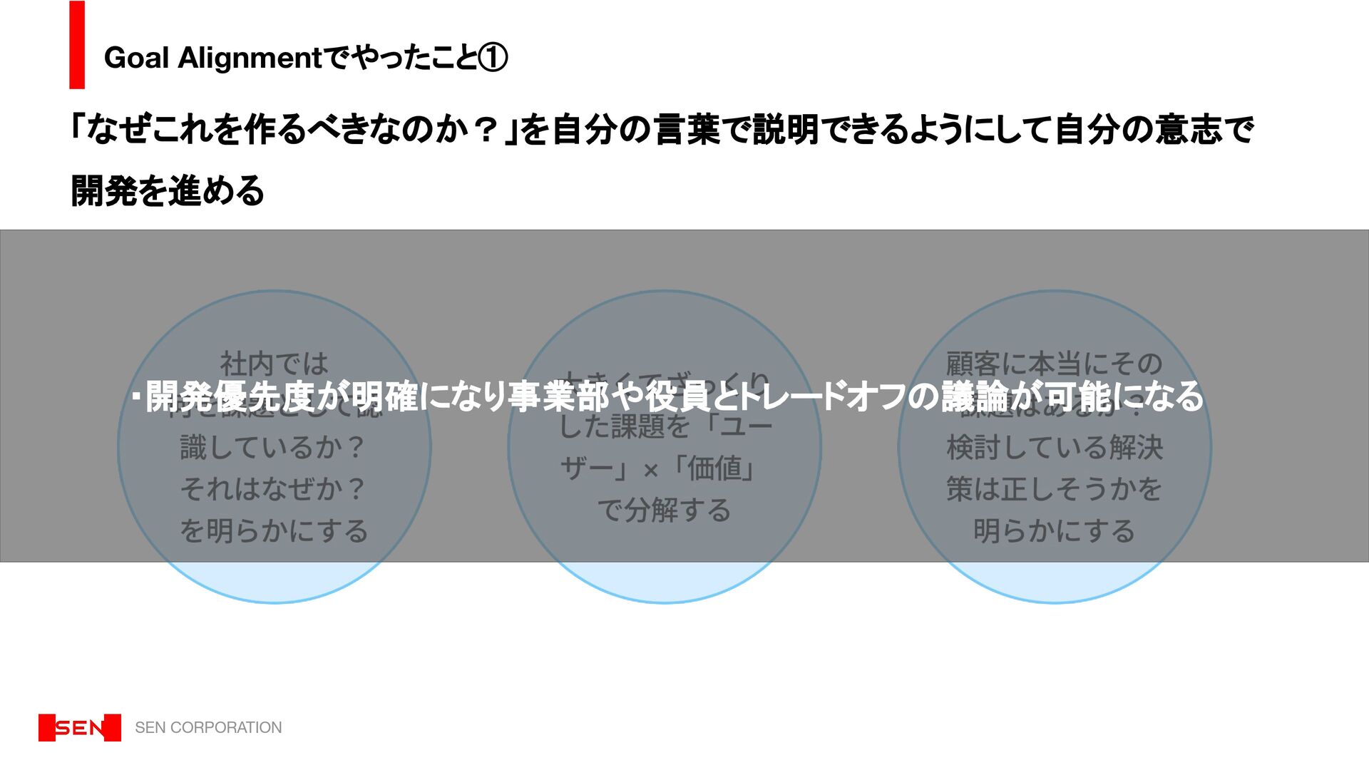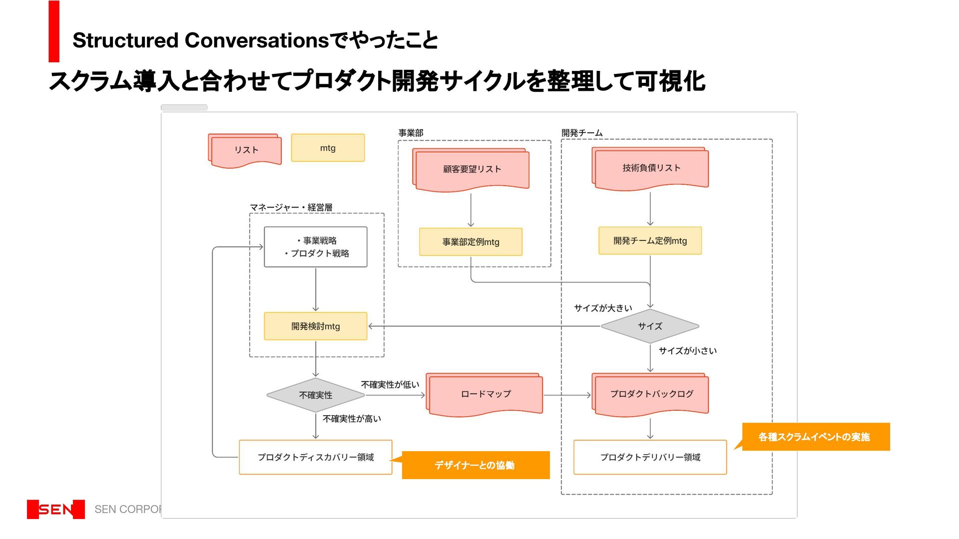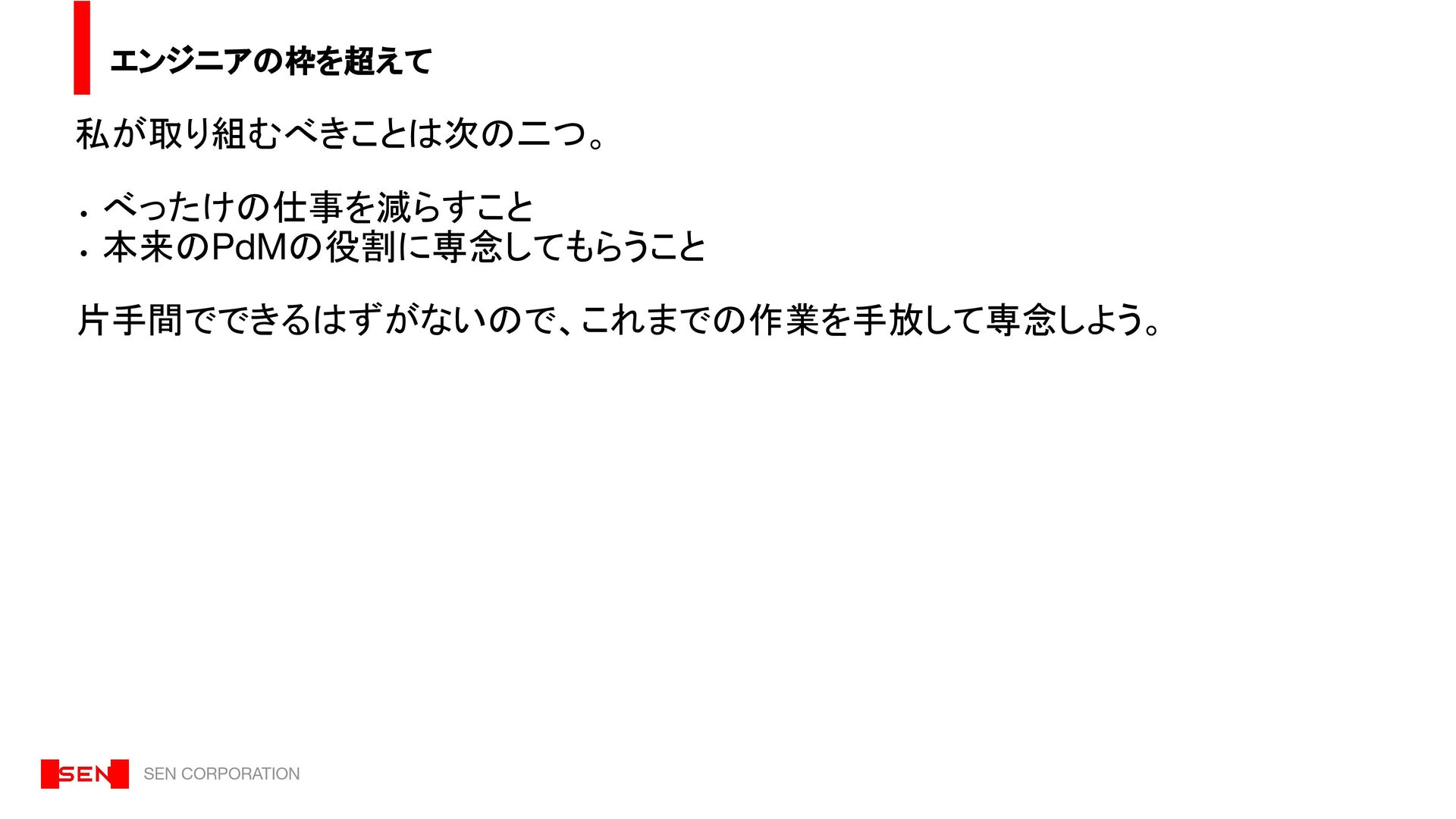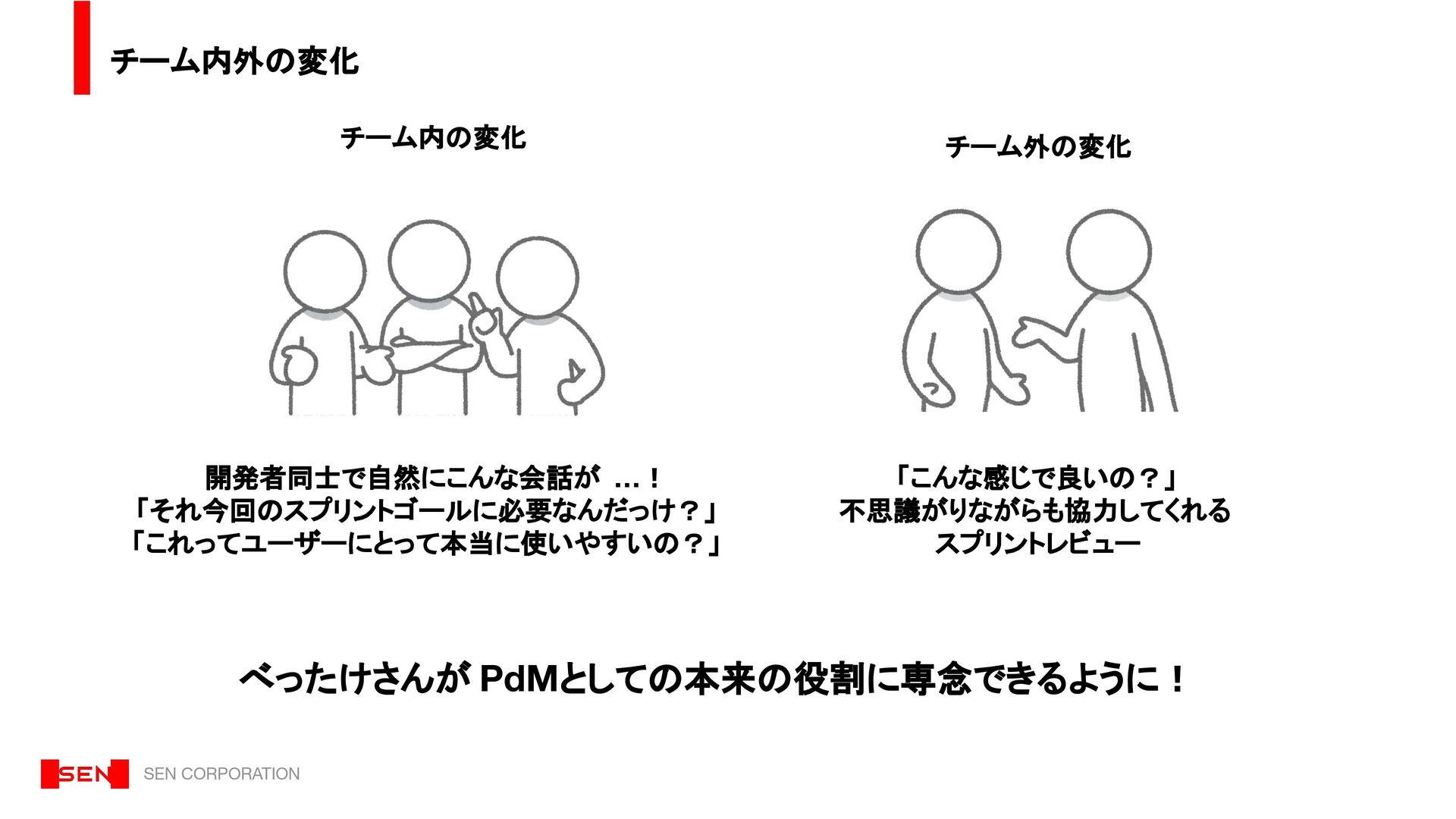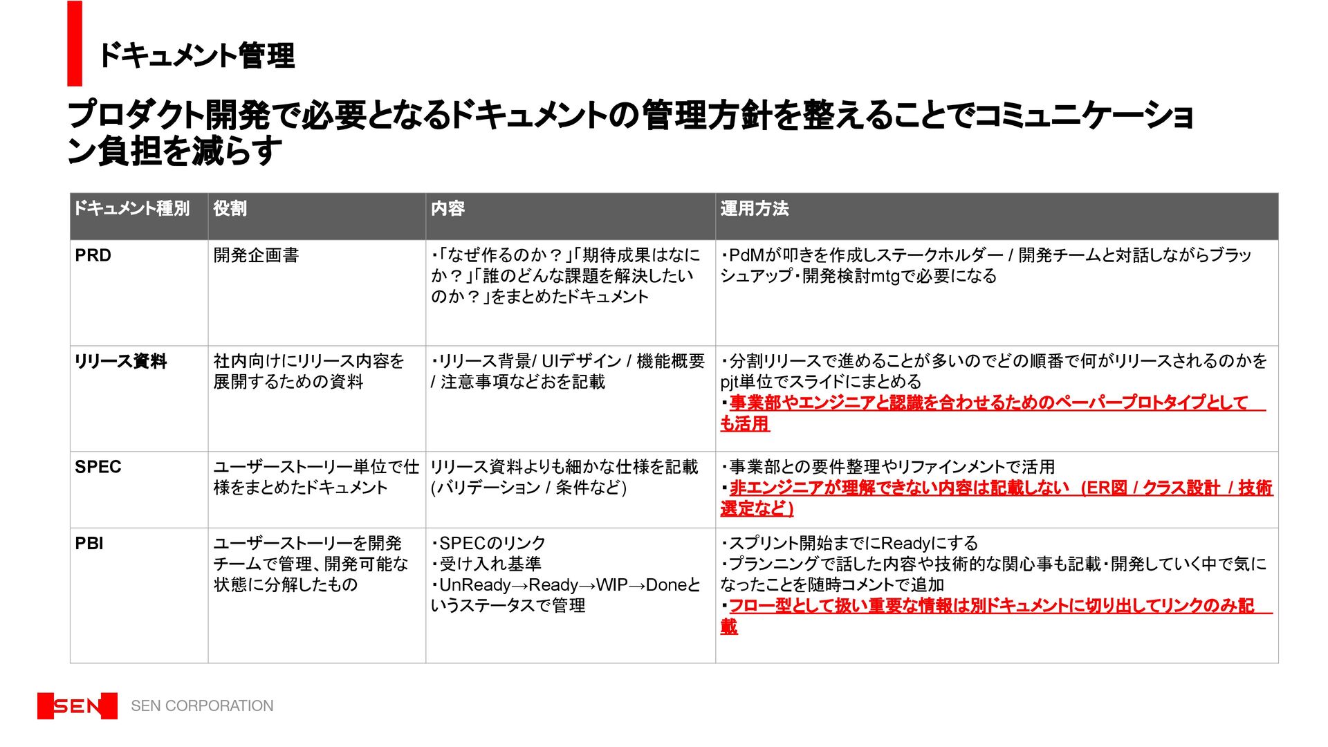 開発企画書 ・「なぜ作るのか?」「期待成果はなに か?」「誰のどんな課題を解決したい のか?」をまとめたドキュメント ・PdMが叩きを作成しステークホルダー / 開発チームと対話しながらブラッ シュアップ・開発検討mtgで必要になる リリース資料 社内向けにリリース内容を 展開するための資料 ・リリース背景/ UIデザイン / 機能概要 / 注意事項などおを記載 ・分割リリースで進めることが多いのでどの順番で何がリリースされるのかを pjt単位でスライドにまとめる ・事業部やエンジニアと認識を合わせるためのペーパープロトタイプとして も活用 SPEC ユーザーストーリー単位で仕 様をまとめたドキュメント リリース資料よりも細かな仕様を記載 (バリデーション / 条件など) ・事業部との要件整理やリファインメントで活用 ・非エンジニアが理解できない内容は記載しない (ER図 / クラス設計 / 技術 選定など) PBI ユーザーストーリーを開発 チームで管理、開発可能な 状態に分解したもの ・SPECのリンク ・受け入れ基準 ・UnReady→Ready→WIP→Doneと いうステータスで管理 ・スプリント開始までにReadyにする ・プランニングで話した内容や技術的な関心事も記載・開発していく中で気に なったことを随時コメントで追加 ・フロー型として扱い重要な情報は別ドキュメントに切り出してリンクのみ記 載