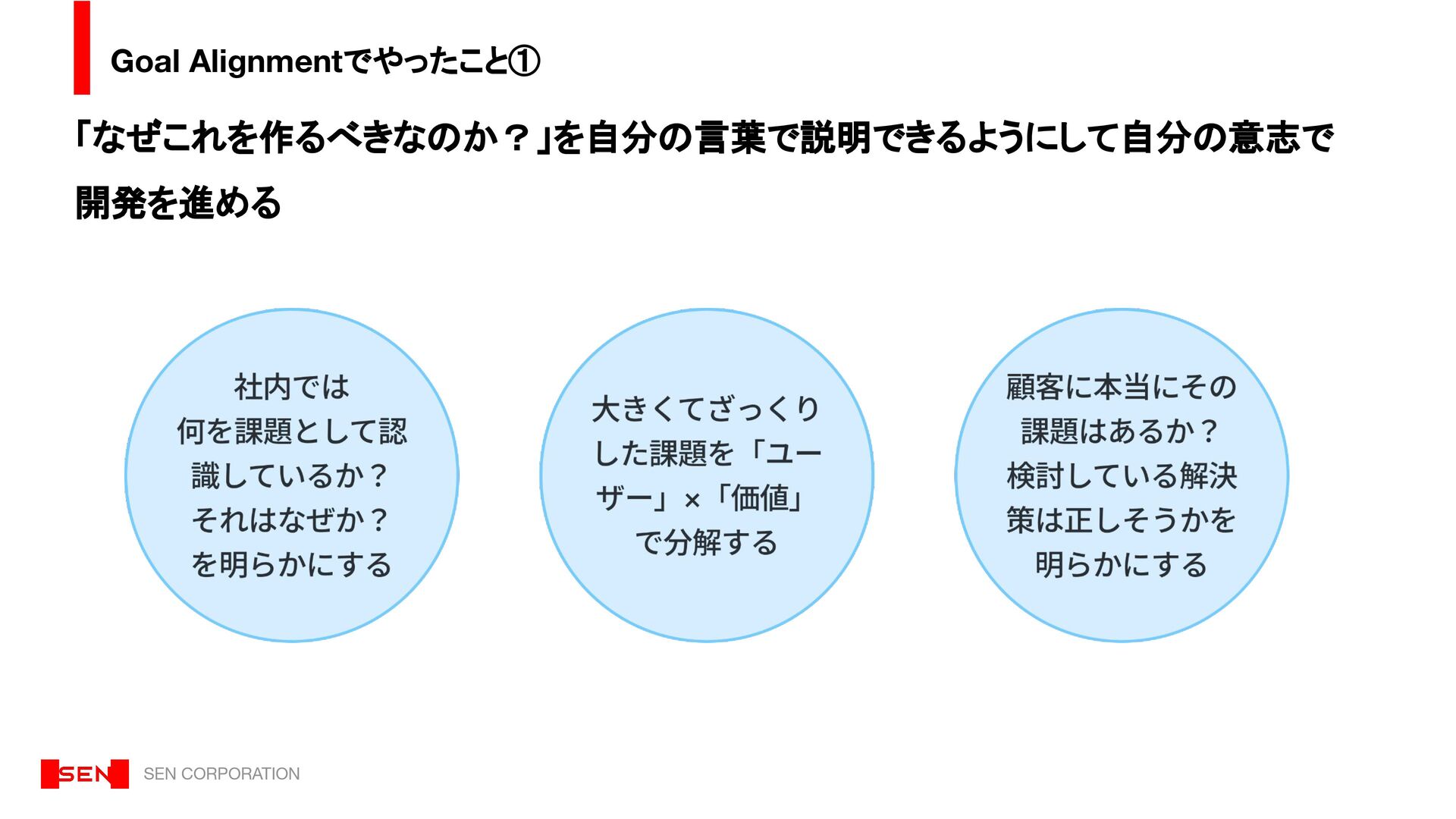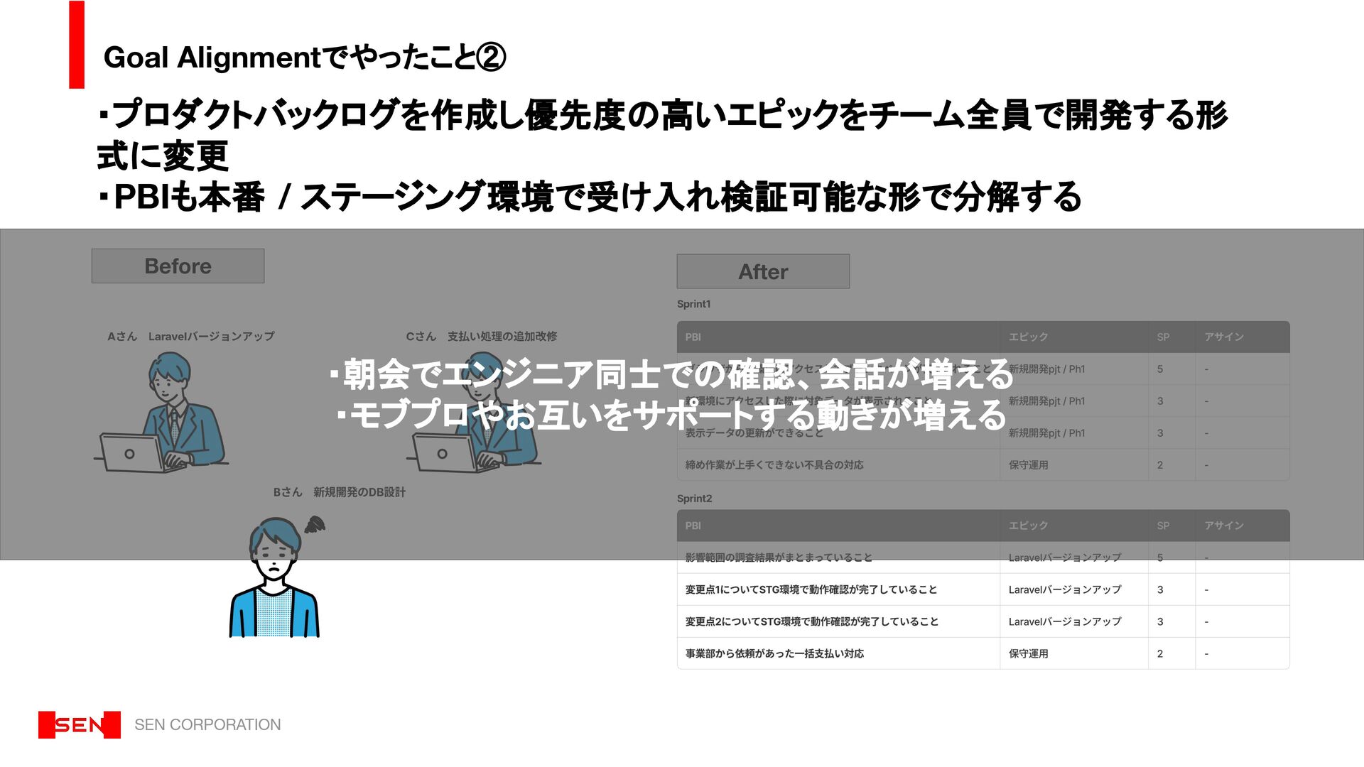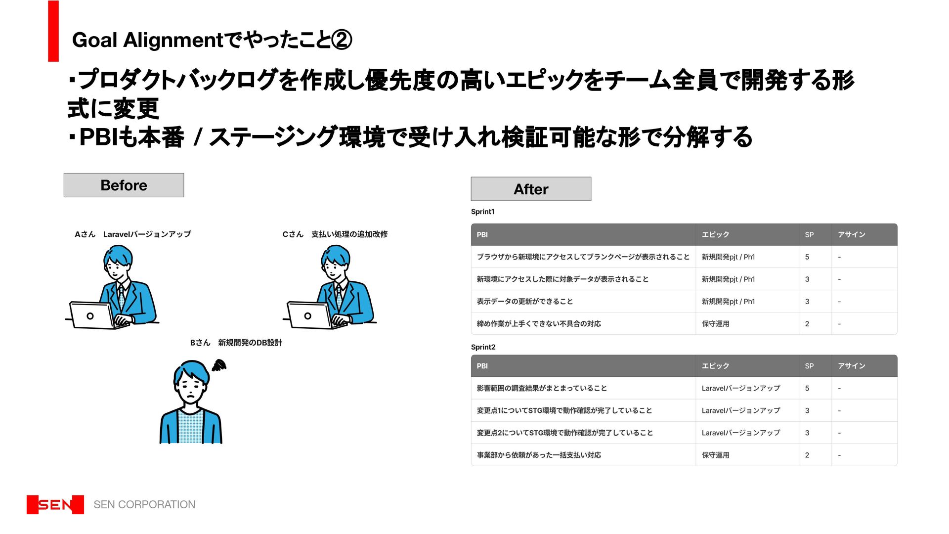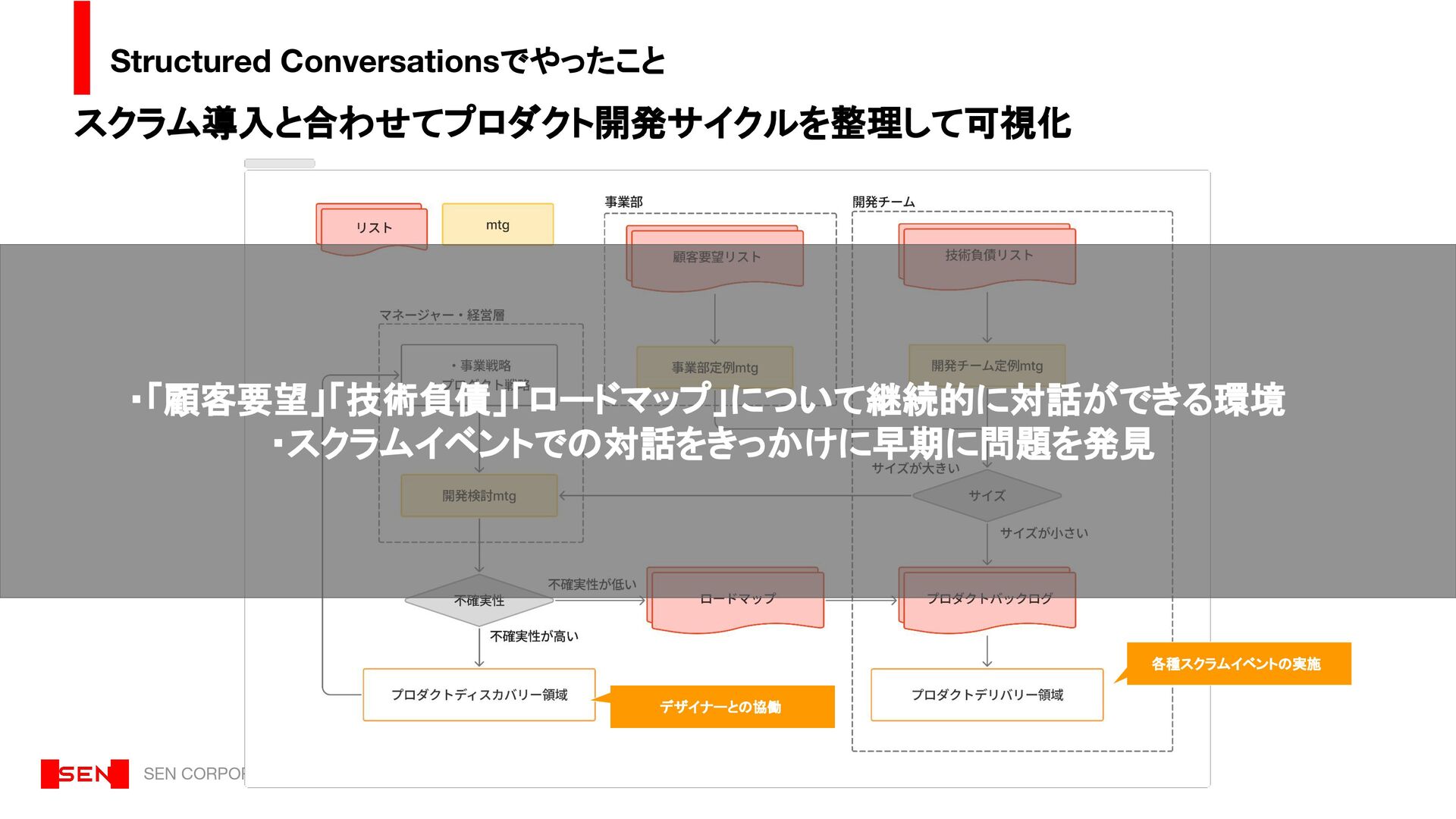 開発企画書 ・「なぜ作るのか?」「期待成果はなに か?」「誰のどんな課題を解決したい のか?」をまとめたドキュメント ・PdMが叩きを作成しステークホルダー / 開発チームと対話しながらブラッ シュアップ・開発検討mtgで必要になる リリース資料 社内向けにリリース内容を 展開するための資料 ・リリース背景/ UIデザイン / 機能概要 / 注意事項などおを記載 ・分割リリースで進めることが多いのでどの順番で何がリリースされるのかを pjt単位でスライドにまとめる ・事業部やエンジニアと認識を合わせるためのペーパープロトタイプとして も活用 SPEC ユーザーストーリー単位で仕 様をまとめたドキュメント リリース資料よりも細かな仕様を記載 (バリデーション / 条件など) ・事業部との要件整理やリファインメントで活用 ・非エンジニアが理解できない内容は記載しない (ER図 / クラス設計 / 技術 選定など) PBI ユーザーストーリーを開発 チームで管理、開発可能な 状態に分解したもの ・SPECのリンク ・受け入れ基準 ・UnReady→Ready→WIP→Doneと いうステータスで管理 ・スプリント開始までにReadyにする ・プランニングで話した内容や技術的な関心事も記載・開発していく中で気に なったことを随時コメントで追加 ・フロー型として扱い重要な情報は別ドキュメントに切り出してリンクのみ記 載