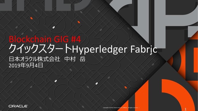| Blockchain GIG #4 クイックスタートHyperledger Fabric 日本オラクル株式会社 中村 岳 2019年9月4日 1