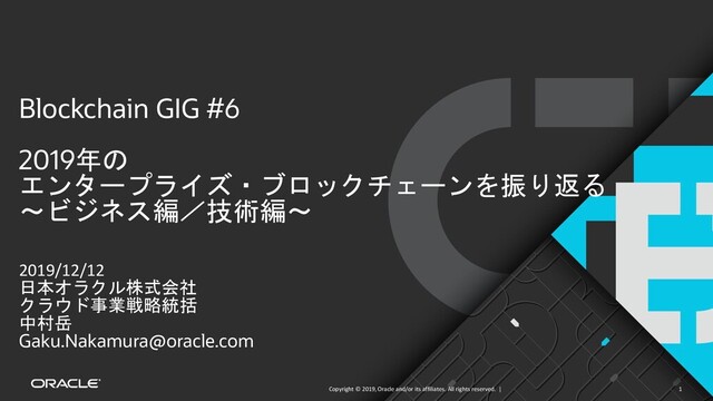 | 1 Blockchain GIG #6 2019年の エンタープライズ・ブロックチェーンを振り返る ~ビジネス編/技術編~ 2019/12/12 日本オラクル株式会社 クラウド事業戦略統括 中村岳