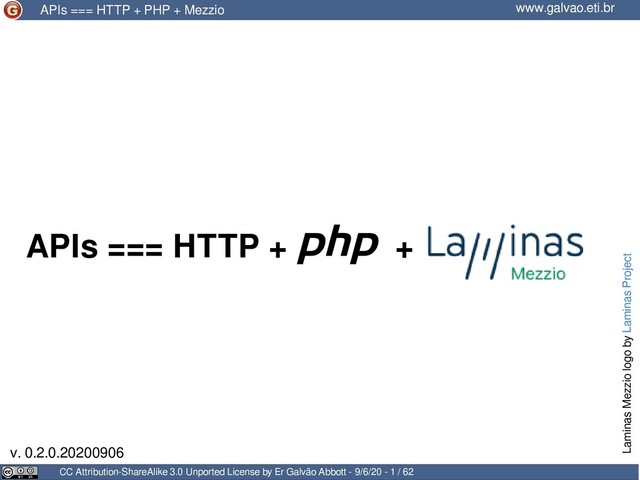 da ConFLOSS Diretor da PHP Conference Brasil Evangelista e Contribuidor para a Linguagem Evangelista Laminas Project (auto-intitulado) Embaixador Fedora LATAM Professor Convidado (Especialista) de Pós-Graduação (PR e SC) 25+ anos desenvolvendo sistemas com interface web 20+ destes com PHP 12+ com Zend Framework / Laminas Project Palestrante em eventos nacionais e internacionais Professor de cursos presenciais e a distância Quem?! CC Attribution-ShareAlike 3.0 Unported License by Er Galvão Abbott - 9/6/20 - 2 / 62 www.galvao.eti.br www.galvao.eti.br APIs === HTTP + PHP + Mezzio