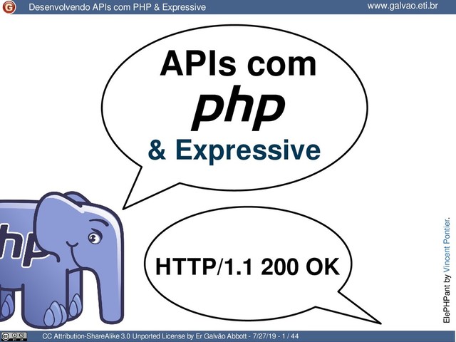Profissionais PHP Diretor da PHP Conference Brasil Evangelista e Contribuidor para a Linguagem Evangelista Laminas Project Embaixador Fedora LATAM Professor Convidado (Especialista) de Pós-Graduação (PR e SC) 25+ anos desenvolvendo sistemas e aplicações com interface web 20+ destes com PHP 12+ com Zend Framework Palestrante em eventos nacionais e internacionais Professor de cursos presenciais e a distância Quem?! CC Attribution-ShareAlike 3.0 Unported License by Er Galvão Abbott - 7/27/19 - 2 / 44 www.galvao.eti.br www.galvao.eti.br Desenvolvendo APIs com PHP & Expressive