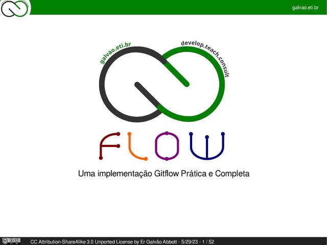 de branching Gitflow: Mais do que duas branches permanentes; Conectada; Com a possibilidade de métricas; Troca rápida entre versões; github.com/galvao-eti/g-flow galvao.eti.br CC Attribution-ShareAlike 3.0 Unported License by Er Galvão Abbott - 5/29/23 - 3 / 52 Objetivo