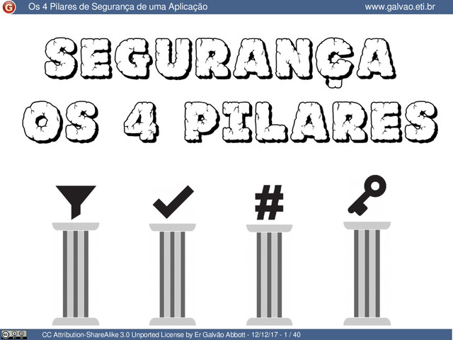 - 12/12/17 - 3 / 40 www.galvao.eti.br Os 4 Pilares de Segurança de uma Aplicação Determinar as 4 práticas que formam a base de segurança de qualquer aplicação, independente de linguagem, arquitetura ou qualquer outra questão tecnológica.