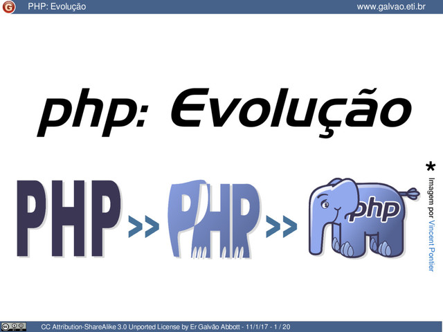 re-escrevem o parser CGI → Nasce a Zend Engine → A Zend Engine (0.5) torna-se a base do PHP 3, lançado em 98 → A linguagem é re-batizada pela última vez: PHP Hypertext Preprocessor → A linguagem ganha a sua mascote oficial: o elePHPant, criado por Vincent Pontier → A primeira versão “popular” da linguagem no Brasil CC Attribution-ShareAlike 3.0 Unported License by Er Galvão Abbott - 11/1/17 - 5 / 20 www.galvao.eti.br PHP: Evolução 1995 1997 “PHP 1” PHP/FI 2 PHP 3 1998 2000 2004 2005 2006 2009 2012 PHP 4 PHP 5 5.1 5.2 5.3 5.4 5.4.11 2013