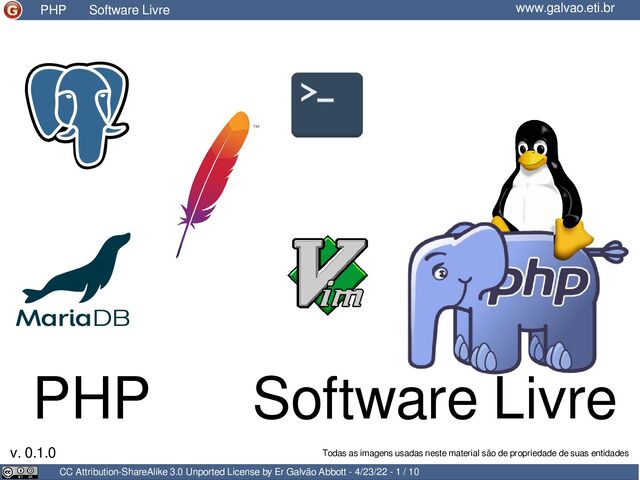 Brasileira de Profissionais PHP Diretor da ConFLOSS e da PHP Conference Brasil Evangelista e Contribuidor para a Linguagem Evangelista Laminas Project Embaixador Fedora LATAM Professor Convidado (Especialista) de Pós-Graduação (PR e SC) 25+ anos desenvolvendo sistemas com interface web 20+ destes com PHP ≃ 15 com Zend Framework / Laminas Project Palestrante em eventos nacionais e internacionais Professor de cursos presenciais e a distância Quem?! CC Attribution-ShareAlike 3.0 Unported License by Er Galvão Abbott - 4/23/22 - 2 / 10 www.galvao.eti.br www.galvao.eti.br
