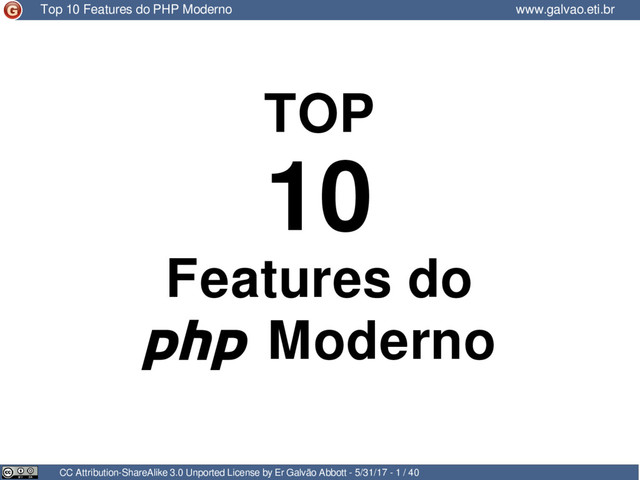da PHP Conference Brasil Contribui para a tradução da documentação oficial Atua como Zend Framework Evangelist para o ZTeam, da Zend. Professor Convidado de Pós-Graduação, PR e SC. 22+ anos desenvolvendo sistemas e aplicações com interface web 17+ destes com PHP 9+ com Zend Framework Palestrante em eventos nacionais e internacionais Instrutor de cursos presenciais e a distância Fundador* e membro do GU PHPRS Site: https://www.galvao.eti.br/ http://people.php.net/galvao Twitter: @galvao Facebook: https://www.facebook.com/galvao.eti.br/ Slides e Documentos: http://slideshare.net/ergalvao https://speakerdeck.com/galvao Github: http://github.com/galvao Posts: https://medium.com/@galvao Quem?! CC Attribution-ShareAlike 3.0 Unported License by Er Galvão Abbott - 5/31/17 - 2 / 40 www.galvao.eti.br Top 10 Features do PHP Moderno