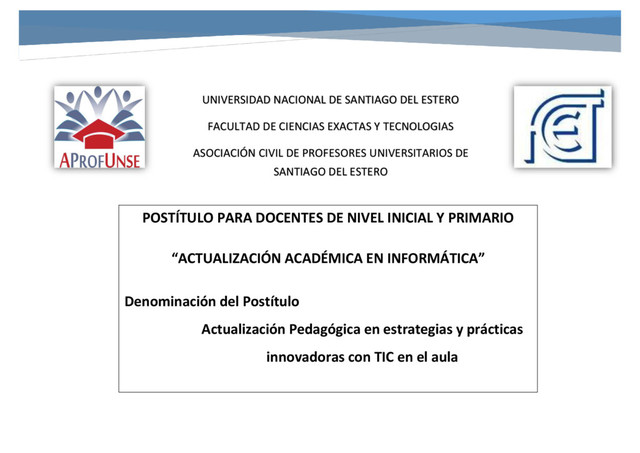 Y TECNOLOGIAS ASOCIACIÓN CIVIL DE PROFESORES UNIVERSITARIOS DE SANTIAGO DEL ESTERO POSTÍTULO PARA DOCENTES DE NIVEL INICIAL Y PRIMARIO “ACTUALIZACIÓN ACADÉMICA EN INFORMÁTICA” Denominación del Postítulo Actualización Pedagógica en estrategias y prácticas innovadoras con TIC en el aula