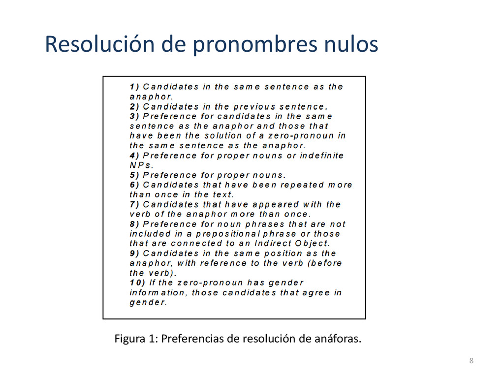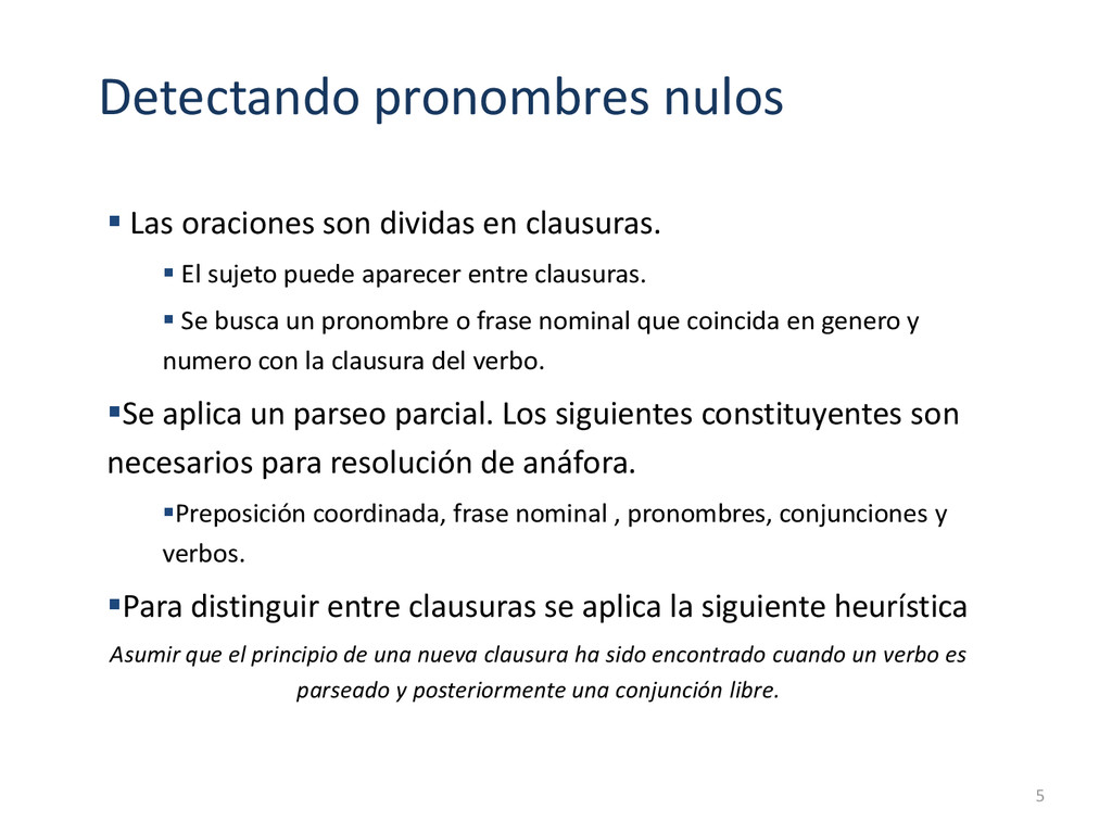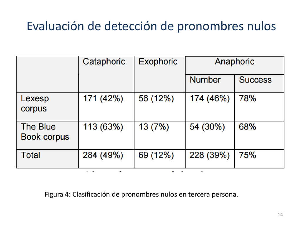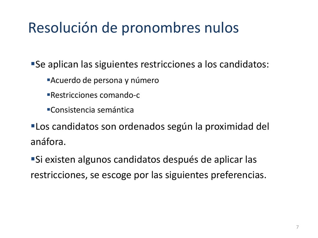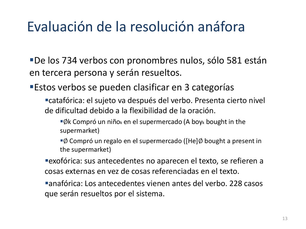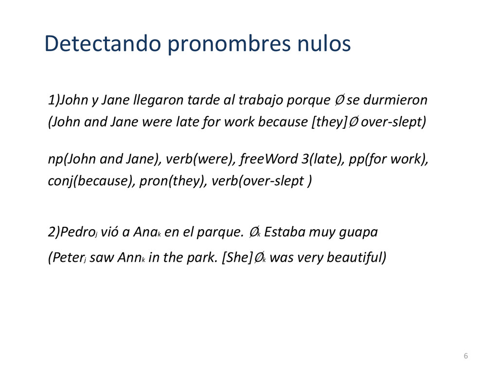 porque ∅ se durmieron (John and Jane were late for work because [they]∅ over-slept) np(John and Jane), verb(were), freeWord 3(late), pp(for work), conj(because), pron(they), verb(over-slept ) 2)Pedroj vió a Anak en el parque. ∅k Estaba muy guapa (Peterj saw Annk in the park. [She]∅k was very beautiful) 6