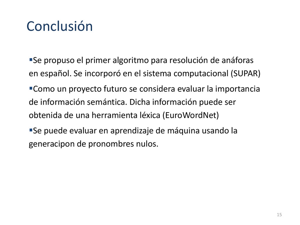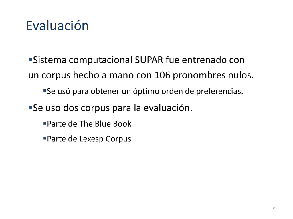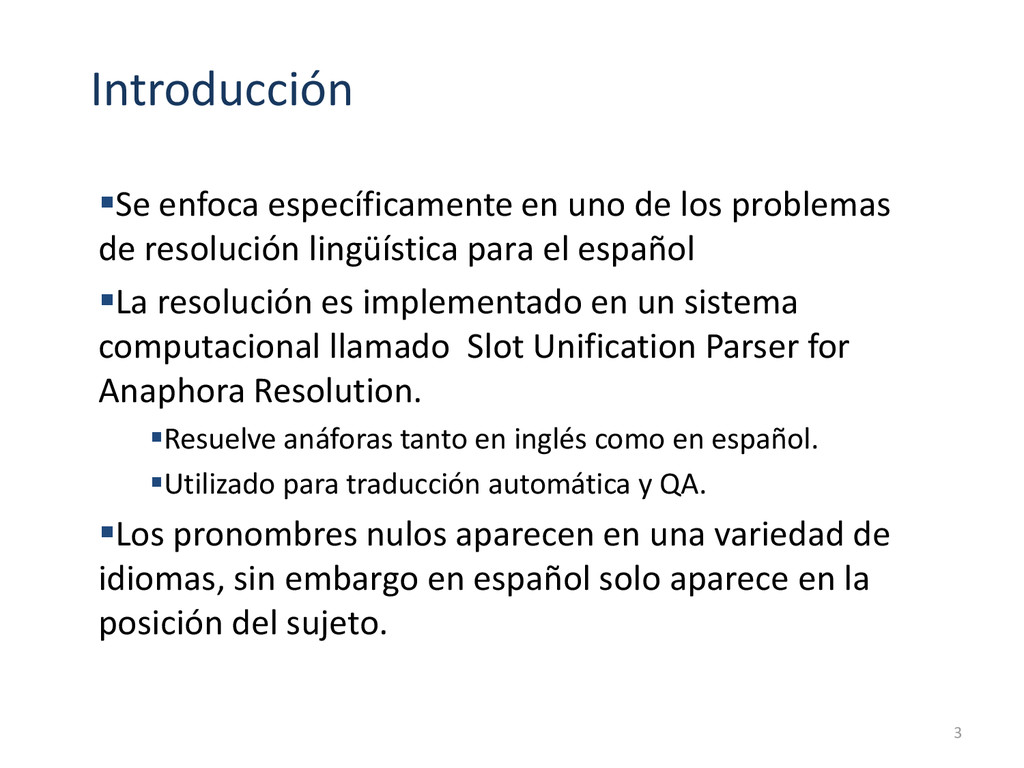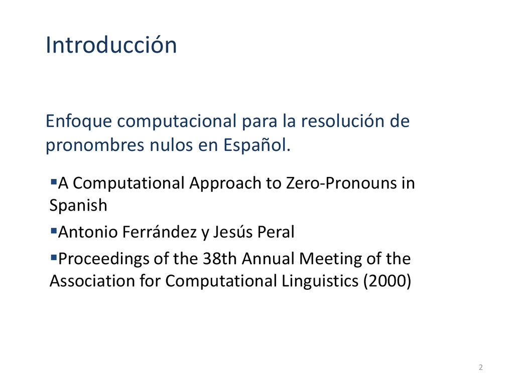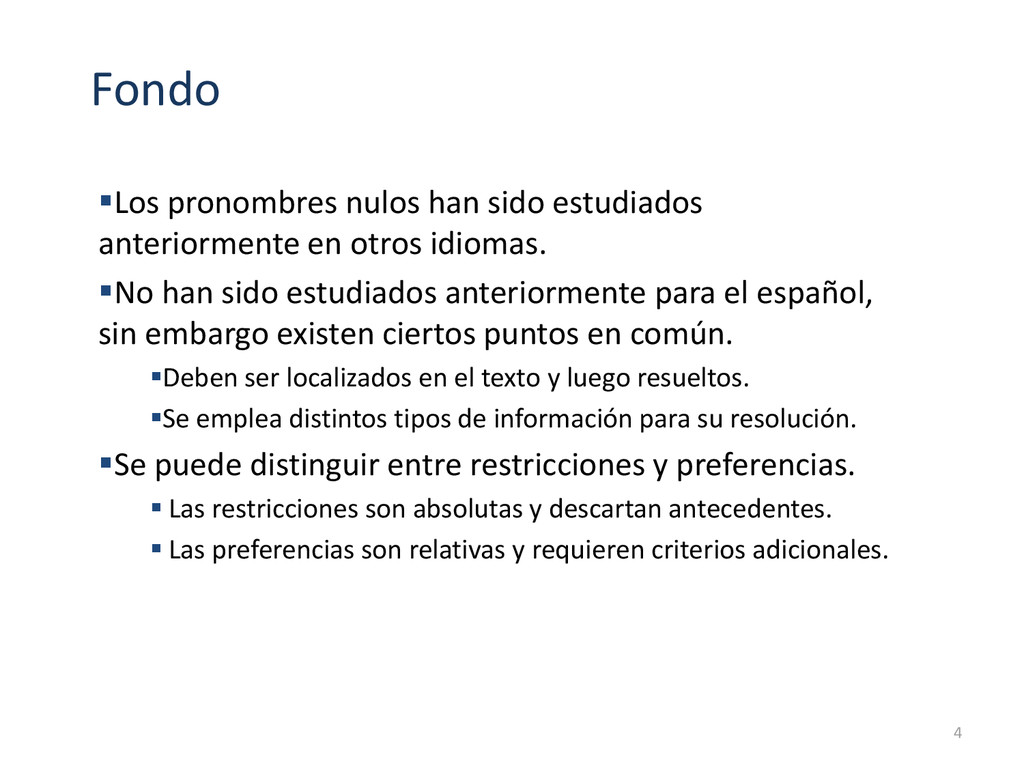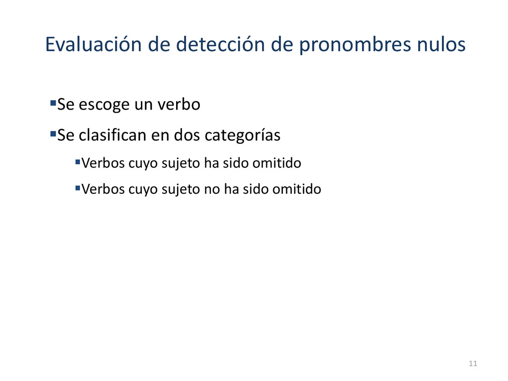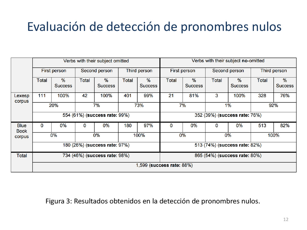 porque ∅ se durmieron (John and Jane were late for work because [they]∅ over-slept) np(John and Jane), verb(were), freeWord 3(late), pp(for work), conj(because), pron(they), verb(over-slept ) 2)Pedroj vió a Anak en el parque. ∅k Estaba muy guapa (Peterj saw Annk in the park. [She]∅k was very beautiful) 6