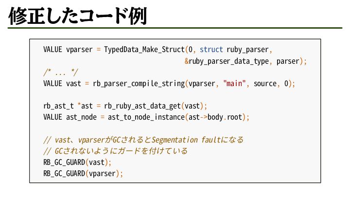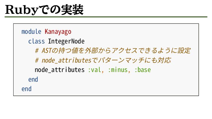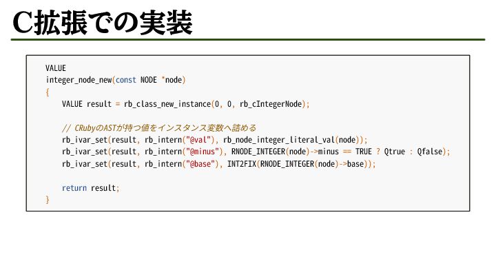 0, rb_cIntegerNode); // CRubyのASTが持つ値をインスタンス変数へ詰める rb_ivar_set(result, rb_intern("@val"), rb_node_integer_literal_val(node)); rb_ivar_set(result, rb_intern("@minus"), RNODE_INTEGER(node)->minus == TRUE ? Qtrue : Qfalse); rb_ivar_set(result, rb_intern("@base"), INT2FIX(RNODE_INTEGER(node)->base)); return result; }