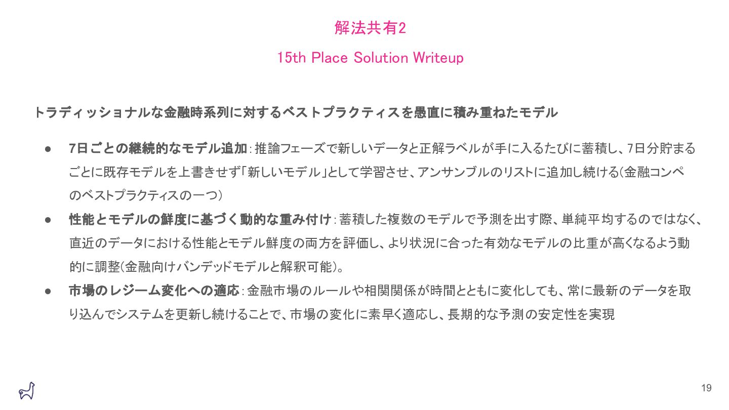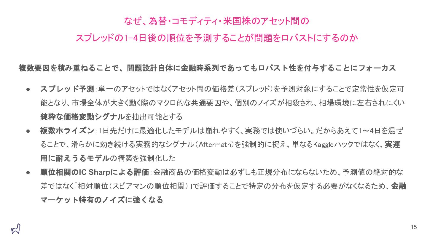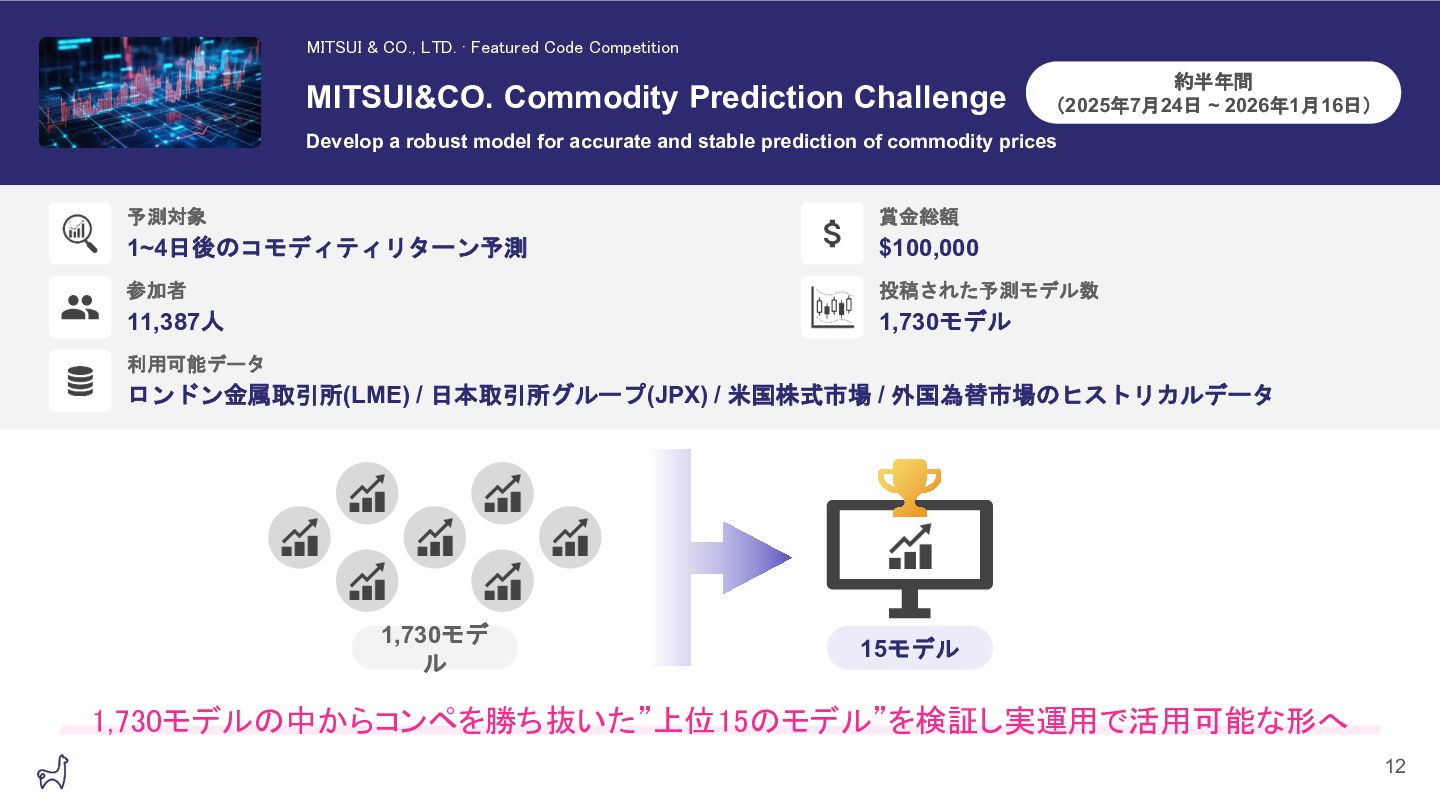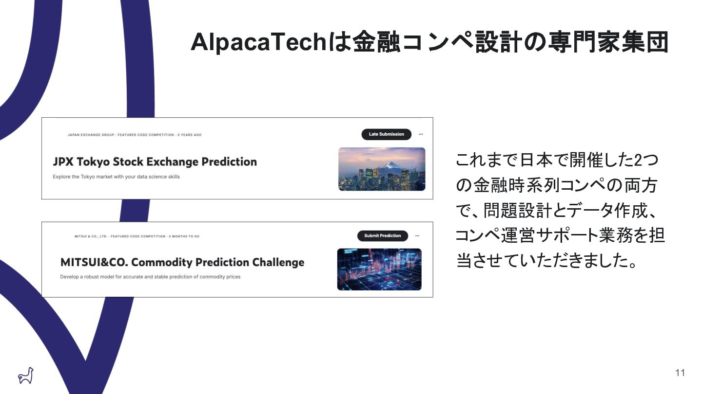 LINEヤフー データサイエンス Meetupの「三井物産コモディティ予測チャレンジ」の舞台裏で発表したAlpacaTechパートの資料です。 https://lycorptech-jp.connpass.com/event/387344/