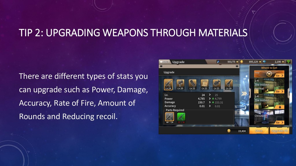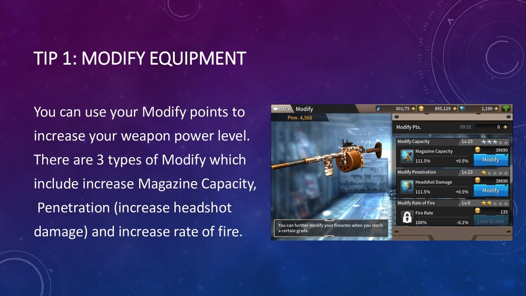 to increase your weapon power level. There are 3 types of Modify which include increase Magazine Capacity, Penetration (increase headshot damage) and increase rate of fire.