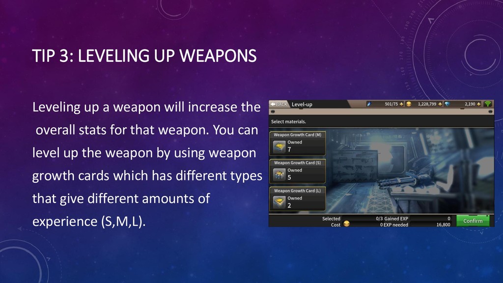 increase the overall stats for that weapon. You can level up the weapon by using weapon growth cards which has different types that give different amounts of experience (S,M,L).