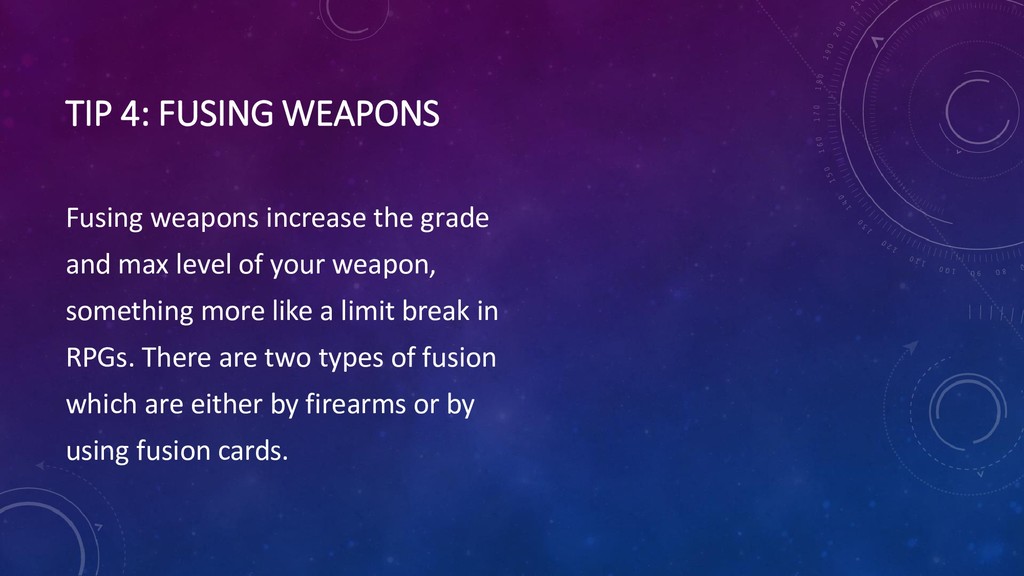 max level of your weapon, something more like a limit break in RPGs. There are two types of fusion which are either by firearms or by using fusion cards.