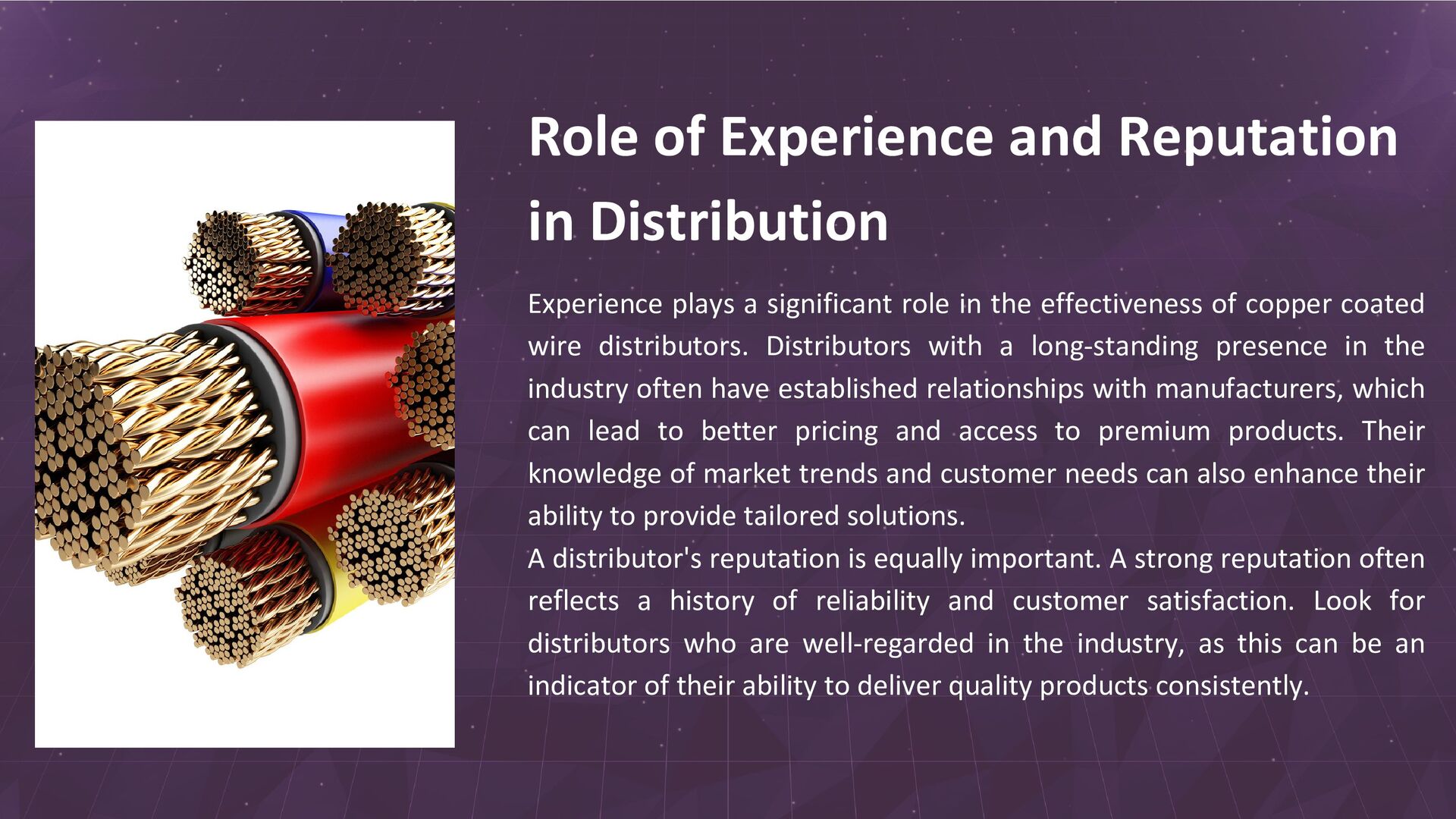significant role in the effectiveness of copper coated wire distributors. Distributors with a long-standing presence in the industry often have established relationships with manufacturers, which can lead to better pricing and access to premium products. Their knowledge of market trends and customer needs can also enhance their ability to provide tailored solutions. A distributor's reputation is equally important. A strong reputation often reflects a history of reliability and customer satisfaction. Look for distributors who are well-regarded in the industry, as this can be an indicator of their ability to deliver quality products consistently.