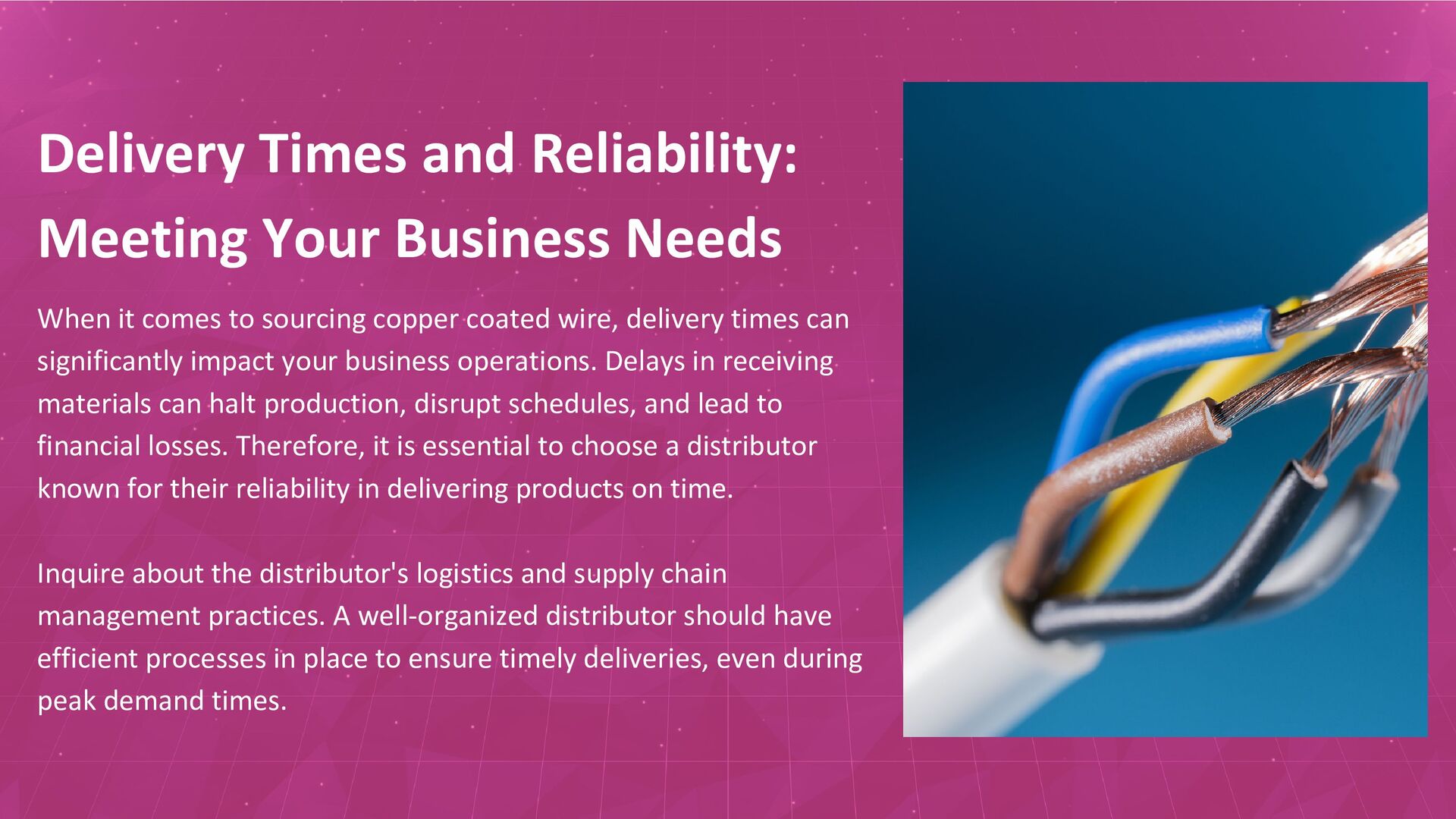 comes to sourcing copper coated wire, delivery times can significantly impact your business operations. Delays in receiving materials can halt production, disrupt schedules, and lead to financial losses. Therefore, it is essential to choose a distributor known for their reliability in delivering products on time. Inquire about the distributor's logistics and supply chain management practices. A well-organized distributor should have efficient processes in place to ensure timely deliveries, even during peak demand times.