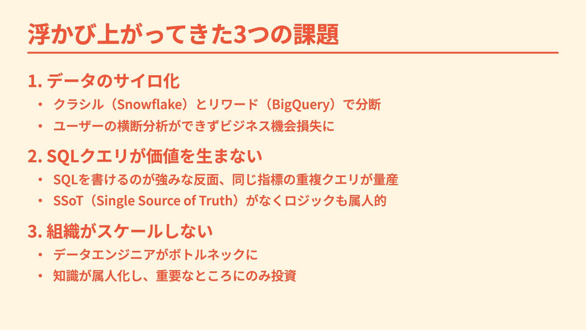 SQLを書けるのが強みな反面、同じ指標の重複クエリが量産 ・ SSoT(Single Source of Truth)がなくロジックも属人的 3. 組織がスケールしない ・ データエンジニアがボトルネックに ・ 知識が属人化し、重要なところにのみ投資