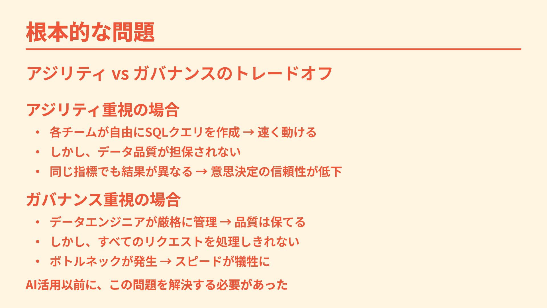 しかし、データ品質が担保されない ・ 同じ指標でも結果が異なる → 意思決定の信頼性が低下 ガバナンス重視の場合 ・ データエンジニアが厳格に管理 → 品質は保てる ・ しかし、すべてのリクエストを処理しきれない ・ ボトルネックが発生 → スピードが犠牲に AI活用以前に、この問題を解決する必要があった