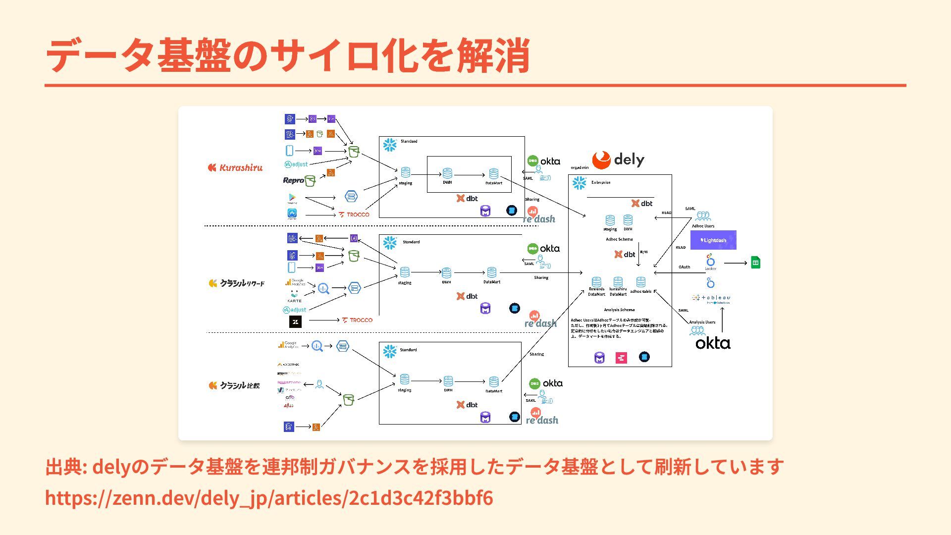 データ基盤のサイロ化を解消 出典: delyのデータ基盤を連邦制ガバナンスを採用したデータ基盤として刷新しています https://zenn.dev/dely_jp/articles/2c1d3c42f3bbf6