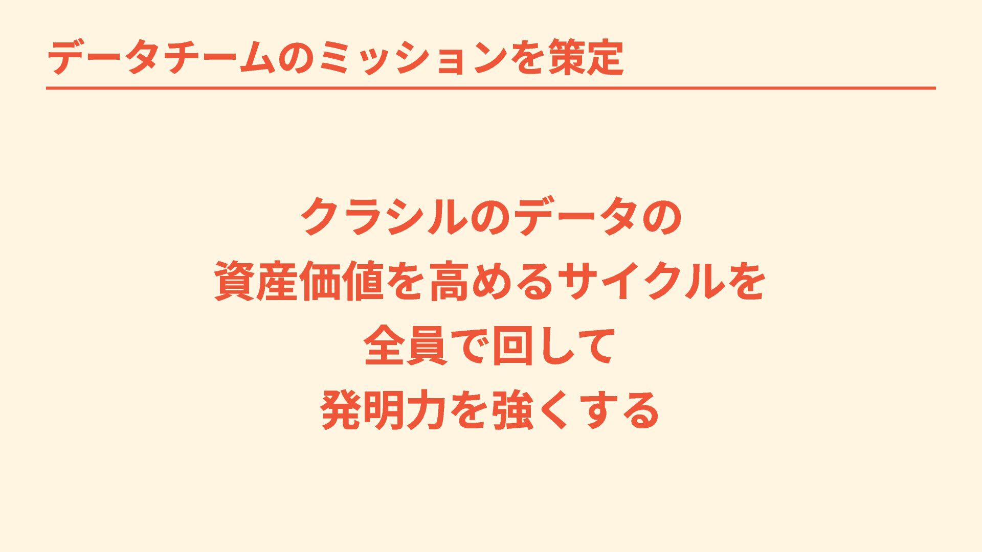 データチームのミッションを策定 クラシルのデータの 資産価値を高めるサイクルを 全員で回して 発明力を強くする