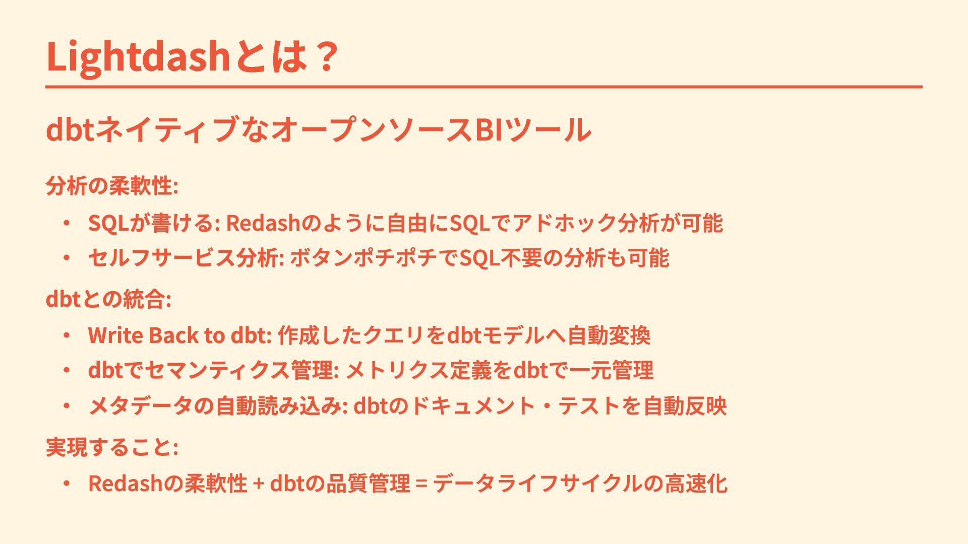 Lightdashとは? dbtネイティブなオープンソースBIツール 分析の柔軟性: ・ SQLが書ける: Redashのように自由にSQLでアドホック分析が可能 ・ セルフサービス分析: ボタンポチポチでSQL不要の分析も可能 dbtとの統合: