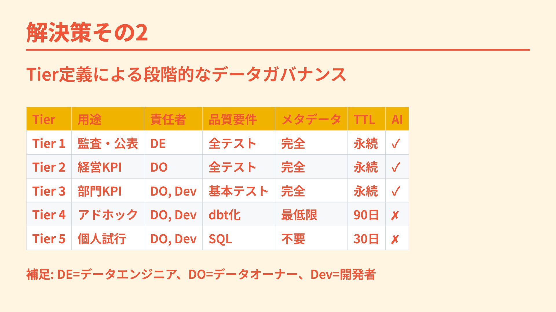 1 監査・公表 DE 全テスト 完全 永続 ✓ Tier 2 経営KPI DO 全テスト 完全 永続 ✓ Tier 3 部門KPI DO, Dev 基本テスト 完全 永続 ✓ Tier 4 アドホック DO, Dev dbt化 最低限 90日 ✗ Tier 5 個人試行 DO, Dev SQL 不要 30日 ✗ 補足: DE=データエンジニア、DO=データオーナー、Dev=開発者